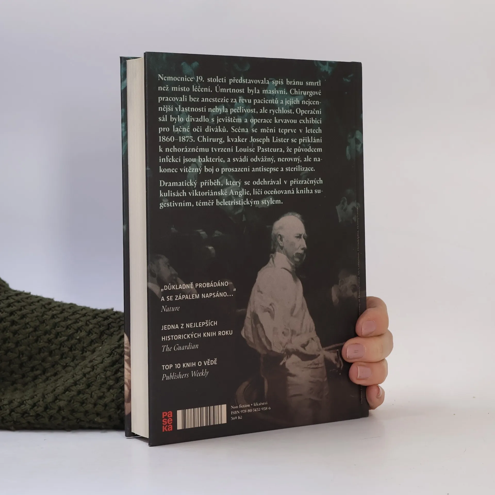 Nemocnice 19. století představovala spíš bránu smrti než místo léčení. Úmrtnost byla masivní. Chirurgové pracovali bez anestezie za řevu pacientů a jejich nejcennější vlastností nebyla pečlivost, ale rychlost. Operační sál bylo divadlo s jevištěm a operace krvavou exhibicí pro lačné oči diváků. Scéna se mění teprve v letech 1860–1875. Chirurg, kvaker Joseph Lister vystupuje s nehorázným tvrzením, že původcem infekcí jsou bakterie, a svádí odvážný, nerovný, ale nakonec vítězný boj o prosazení antisepse a sterilizace. Dramatický příběh, který se odehrával v přízračných kulisách viktoriánské Anglie, líčí oceňovaná kniha sugestivním, téměř beletristickým stylem.