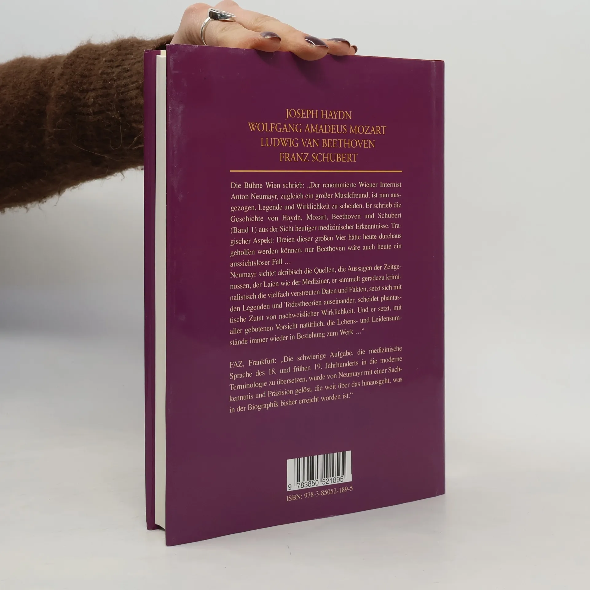 Medizinische Geschichte von Haydn, Mozart, Beethoven und Schubert (Band 1). Die Bühne Wien schrieb: Der renommierte Wiener Internist Anton Neumayr, zugleich ein großer Musikfreund, ist nun ausgezogen, Legende und Wirklichkeit zu scheiden. Er schrieb die Geschichte von Haydn, Mozart, Beethoven und Schubert (Band 1) aus der Sicht heutiger medizinischer Erkenntnisse. Tragischer Aspekt: Dreien dieser großen Vier hätte heute durchaus geholfen werden können, nur Beethoven wäre auch heute ein aussichtsloser Fall … Neumayr sichtet akribisch die Quellen, die Aussagen der Zeitgenossen, der Laien wie der Mediziner, er sammelt geradezu kriminalistisch die vielfach verstreuten Daten und Fakten, setzt sich mit den Legenden und Todestheorien auseinander, scheidet phantastische Zutat von nachweislicher Wirklichkeit. Und er setzt, mit aller gebotenen Vorsicht natürlich, die Lebens- und Leidensumstände immer wieder in Beziehung zum Werk … FAZ, Frankfurt: Die schwierige Aufgabe, die medizinische Sprache des 18. und frühen 19. Jahrhunderts in die moderne Terminologie zu übersetzen, wurde von Neumayr mit einer Sachkenntnis und Präzision gelöst, die weit über das hinausgeht, was in der Biographik bisher erreicht worden ist.