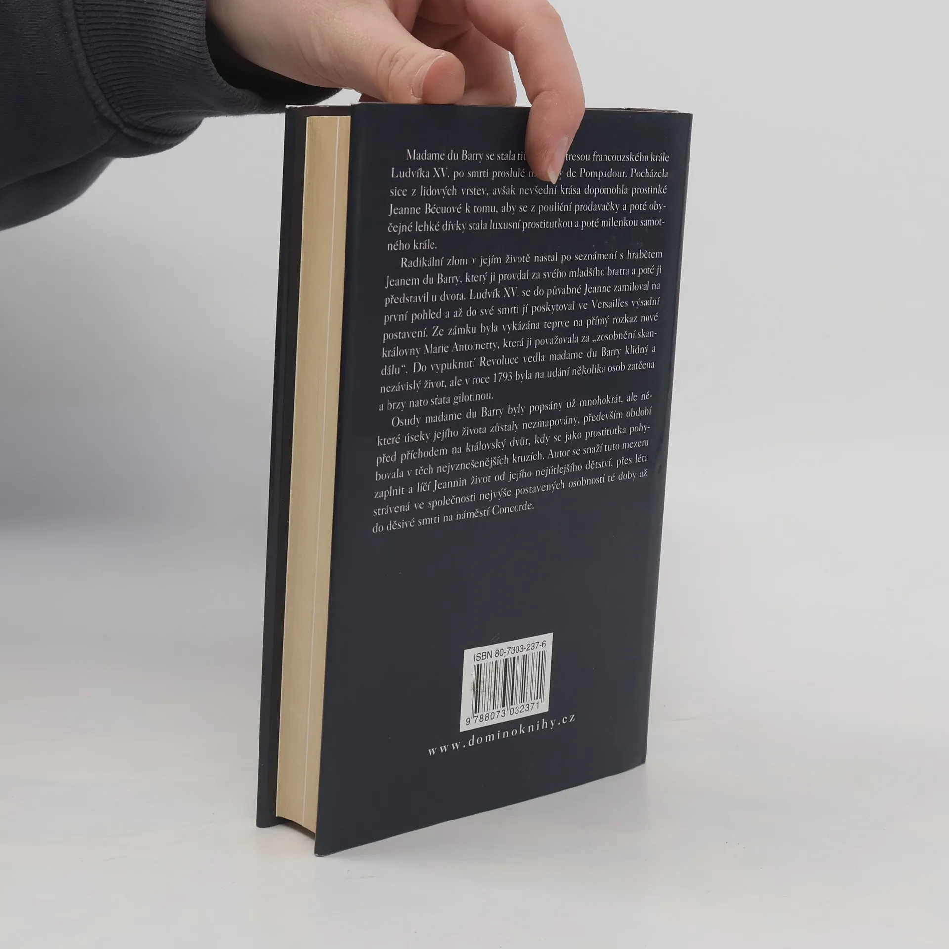 Madame du Barry se stala titulární metresou francouzského krále Ludvíka XV. po smrti proslulé markýzy de Pompadour. Pocházela sice z lidových vrstev, avšak nevšední krása dopomohla prostinké Jeanne Bécuové k tomu, aby se z pouliční prodavačky a poté obyčejné lehké dívky stala luxusní prostitutkou a poté milenkou samotného krále. Radikální zlom v jejím životě nastal po seznámení s hrabětem Jeanem du Barry, který ji provdal za svého mladšího bratra a poté ji představil u dvora. Ludvík XV. se do půvabné Jeanne zamiloval na první pohled a až do své smrti jí poskytoval ve Versailles výsadní postavení. Ze zámku byla vykázána teprve na přímý rozkaz nové královny Marie Antoinetty, která ji považovala za "zosobnění skandálu". Do vypuknutí Revoluce vedla madame du Barry klidný a nezávislý život, ale v roce 1793 byla po udání několika osob zatčena a brzy nato sťata gilotinou. Osudy madame du Barry byly popsány už mnohokrát, ale některé úseky jejího života zůstaly nezmapovány, především období před příchodem na královský dvůr, kdy se jako prostitutka pohybovala v těch nejvznešenějších kruzích. Autor se snaží tuto mezeru zaplnit a líčí Jeannin život od jejího nejútlejšího dětství, přes léta strávená ve společnosti nejvýše postavených osobností té doby až do děsivé smrti na náměstí Concorde.