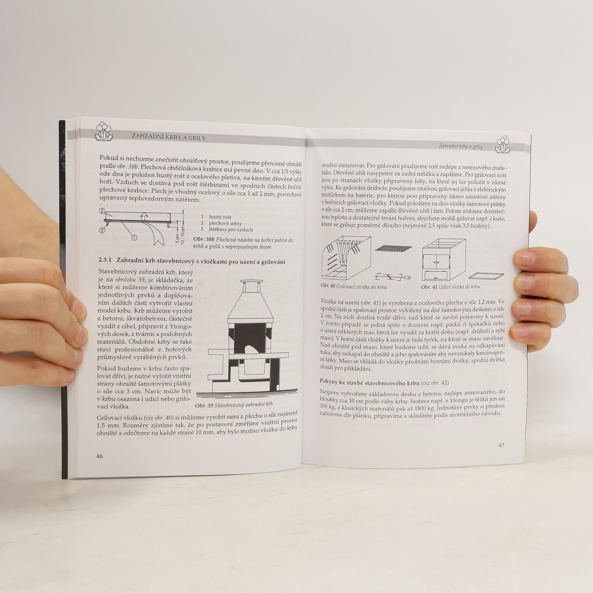 Obsah je rozdělen do šesti kapitol, a k nim jsou přidány dvě přílohy. 1.) Zahrada jako prostor pro rekreaci a setkávání 2.) Zahradní krby a grily 3.) Společenské zahradní krby a sestavy 4.) Krby přistavěné k objektu 5.) Grily na plyn 6.) Udírny Příloha 1: Recepty na grilování Příloha 2: Uzení masa, ryb a drůbeže