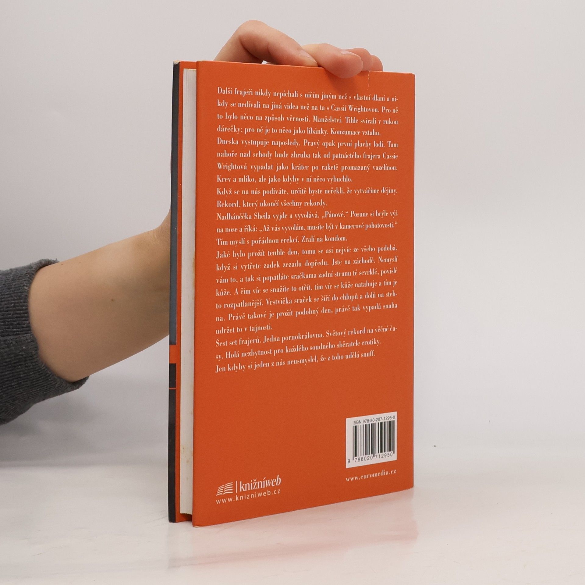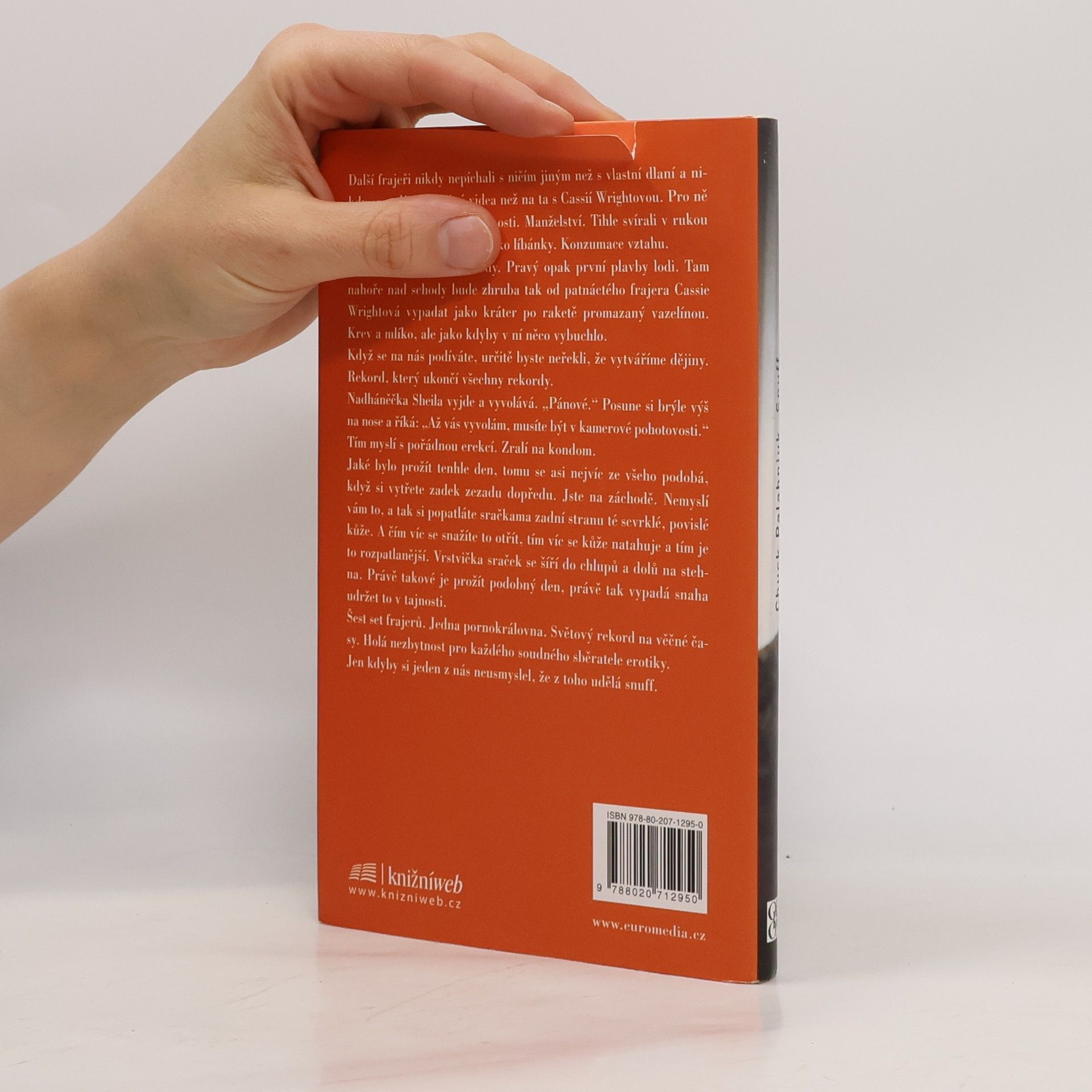 Román pro tři pornoherce a jednu asistentku. Termínem "snuff" se označují ilegální pornofilmy, v nichž je zachycena vražda či zabití. Nebo předstírání téhož, ale to už není ono. Jde o žádané zboží na trhu. V Palahniukově románu jde o smrt netradiční a přízračnou - jinak to ani u něj být nemůže: slavná pornoherečka Cassie Wrightová chce překonat stávající rekord v souložení s muži, který vytvořila Annabel Chong. Ta za deset hodin absolvovala 251 milostných aktů se zhruba sedmdesáti muži. Cassie nechce podvádět, a tak hodlá obsloužit rovných 600 mužů. A smrt? Podle Palahniuka nedokáže lidské tělo zvládnout takovou zátěž, herečka předpokládá, že při tom zemře na embolii. Cassie chce utvořit rekord na věčné časy: doufá, že když při něm zemře, oficiální místa honbu za dalšími rekordy zakáží a její výkon zůstane navždy nejlepší. Každý z oněch 600 mužů má svůj specifický důvod. Číslo 600 je bývalý slavný pornoherec Branch Bacardi, který s Cassie, které je skoro čtyřicet, natočil spoustu scén. Číslo 137 by si Cassie chtěl vzít a pořád se dopuje viagrou. A číslo 72 je její odložený syn, jenž touží po setkání s matkou. Všichni tři čekají v místnosti k prasknutí nacpané dalšími muži, kteří se udržují neustále připraveni k akci, v čemž je podporují i slavné filmové kousky z profesionální minulosti hlavní aktérky. Show může začít.