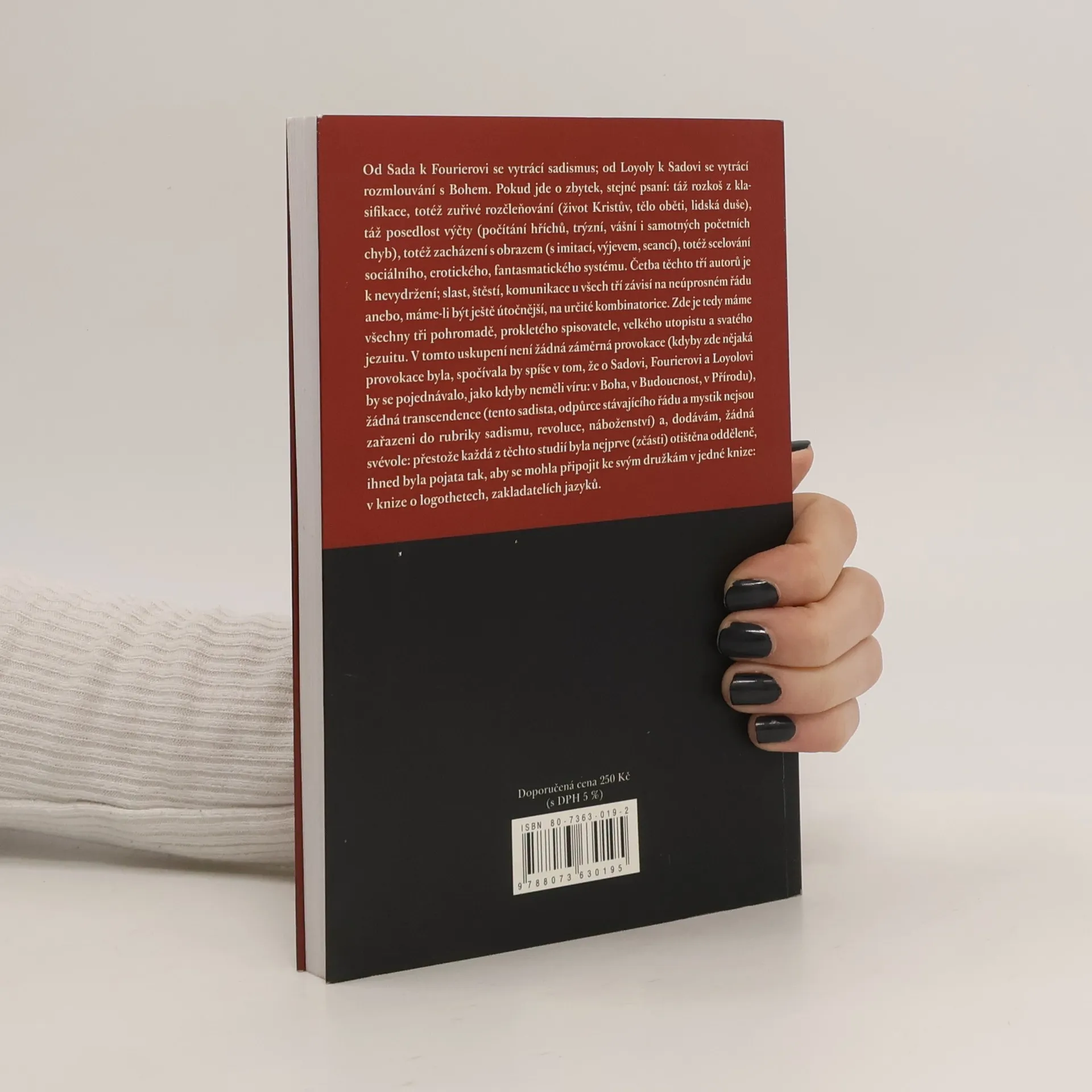 Sade, Fourier a Ignác z Loyoly byli klasifikátoři, zakladatelé jazyků: jazyk erotické slasti, jazyk sociálního štěstí a jazyk rozmlouvání s Bohem — každý z nich vložil do budování tohoto sekundárního jazyka veškerou energii své vášně. Vynalézání znaků však paradoxně znamená vstup do oné dodatečnosti smyslu, jakou je označující; jedním slovem znamená to praktikovat psaní. Cílem této knihy není navracet se k myšlenkovému obsahu, který obvykle našim třem autorům připisujeme, tedy k filozofii zla, k utopickému socialismu a k mystice poslušnosti, nýbrž brát Sada, Fouriera a Loyolu jako formulátory, vynálezce psaní, operátory textu.