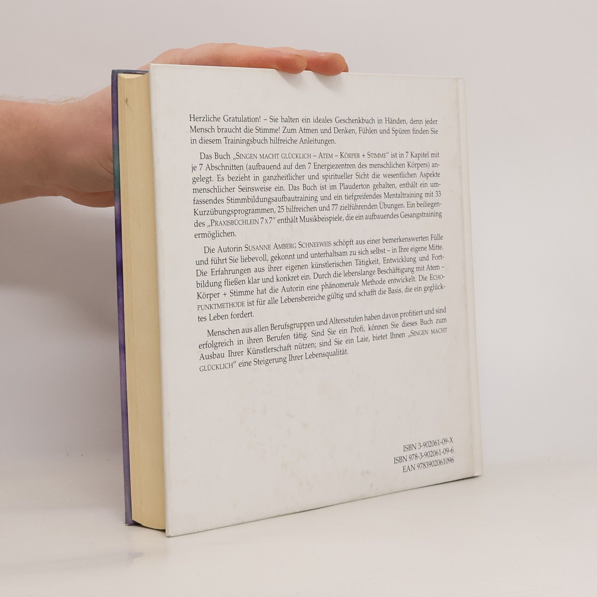 Das Buch ist in 7 Kapitel mit je 7 Abschnitten (aufbauend auf den 7 Energiezentren des menschlichen Körpers) angelegt. Es bezieht in ganzheitlicher und spiritueller Sicht die wesentlichen Aspekte menschlicher Seineweise ein. Das Buch ist im Plauderton gehalten, enthält ein umfassendes Stimmbildungsaufbautraining und ein tiefgreifendes Mentaltraining mit 33 Kurzübungsprogrammen, 25 hilfreichen und 77 zielführenden Übungen. Ein beiliegendes „Praxisbüchlein 7x7“ enthält Musikbeispiele, die ein aufbauendes Gesangstraining ermöglichen. - Die Autorin ist in Wien tätig.