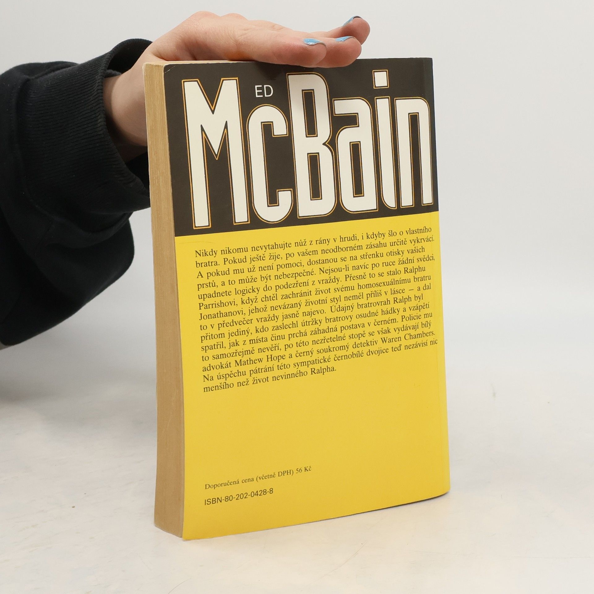 Nikdy nikomu nevytahujte nůž z rány v hrudi, i kdyby šlo o vlastního bratra. Pokud ještě žije, po vašem neodborném zásahu určite vykrvácí. A pokud mu už není pomoci, dostanou se na střenku otisky vašich prstů, a to může být nebezpečné. Nejsou-li navíc po ruce žádní svědci, upadnete logicky do podezření z vraždy. Přesne to se stalo Ralphu Parrishovi, když chtěl zachránit život svému homosexuálnímu bratru Jonathanovi, jehož nevázaný životní styl neměl příliš v lásce - a dal to v předvečer vraždy jasně najevo. Údajný bratrovrah Ralph byl přitom jediný, kdo zaslechl útržky bratrovy osudné hádky a vzápětí spatřil, jak z místa činu prchá záhadná postava v černém. Policie mu to samozřejmě neveří, po této nezřetelné stopě se však vydávají bílý advokát Mathew Hope a černý soukromý detektiv Waren Chambers. Na úspěchu pátrání této sympatické černobílé dvojice teď závisí nic menšího než život nevinného Ralpha.