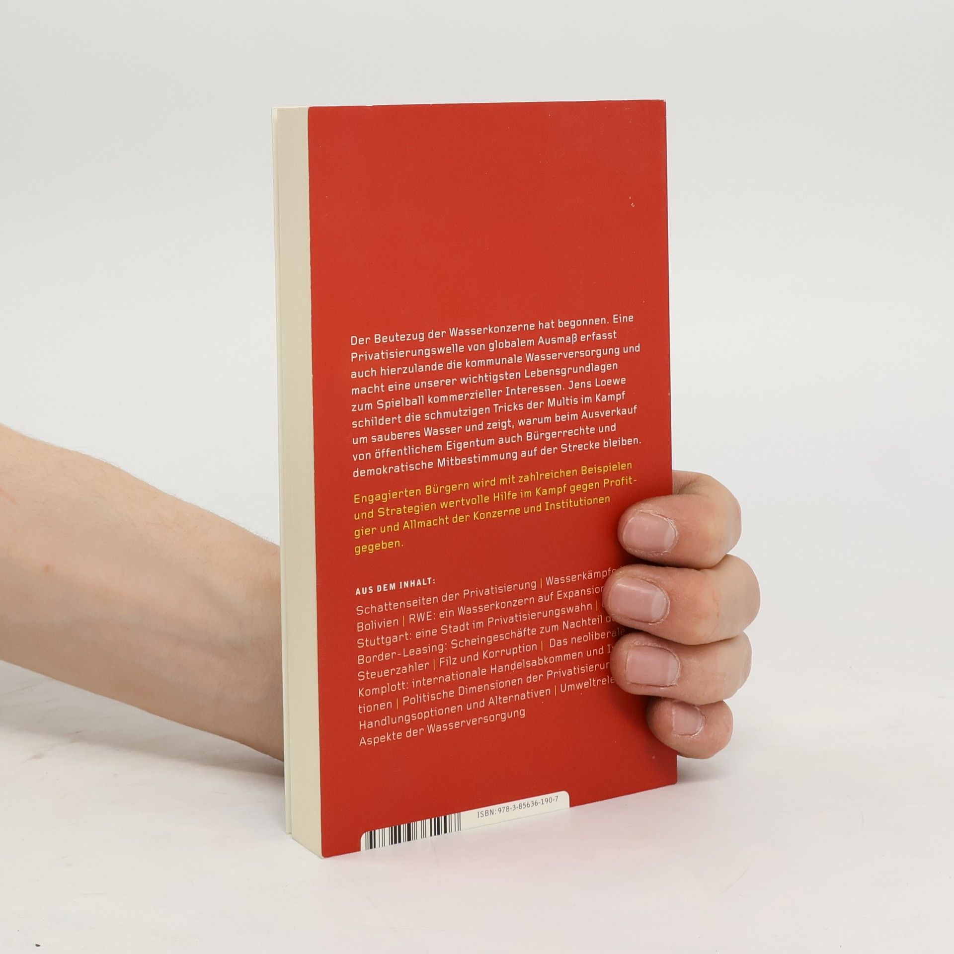 Der Beutezug der Wasserkonzerne hat begonnen. Eine Privatisierungswelle von globalem Ausmaß erfasst auch hierzulande die kommunale Wasserversorgung und macht eine unserer wichtigsten Lebensgrundlagen zum Spielball kommerzieller Interessen. Jens Loewe schildert die schmutzigen Tricks der Multis im Kampf um sauberes Wasser und zeigt, warum beim Ausverkauf von öffentlichem Eigentum auch Bürgerrechte und demokratische Mitbestimmung auf der Strecke bleiben. AUS DEM INHALT: Schattenseiten der Privatisierung · Wasserkämpfe in Bolivien · RWE: ein Wasserkonzern auf Expansionskurs? · Stuttgart: eine Stadt im Privatisierungswahn · CrossBorder-Leasing: Scheingeschäfte zum Nachteil der Steuerzahler · Filz und Korruption · Das neoliberale Komplott: internationale Handelsabkommen und Institutionen · Politische Dimensionen der Privatisierung · Handlungsoptionen und Alternativen · Umweltrelevante Aspekte der Wasserversorgung