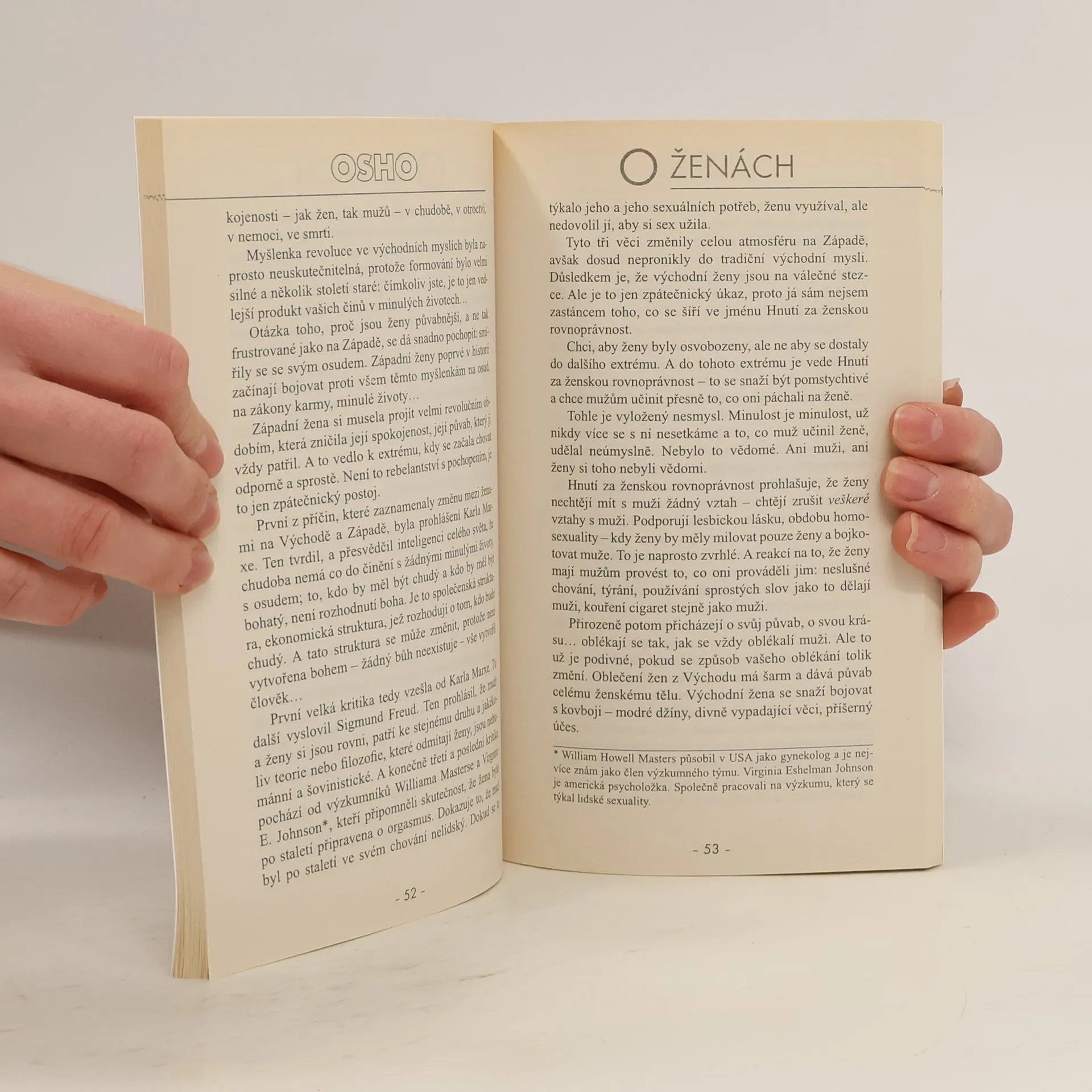 Velký guru odpovídá na otázky týkající se témat žena-muž, feminismus, sexualita, homosexualita, manželství, láska, vztah, mateřství. "Když si milenci navzájem říkají - nemůžu bez tebe žít, není to o tom, že by se podváděli, myslí to vážně. Ale neznají podstatu života. Zítra to bude tatáž žena, ale nebude vypadat tak krásně. A v průběhu dalších dní se oba, muž i žena, budou cítit uvězněni."