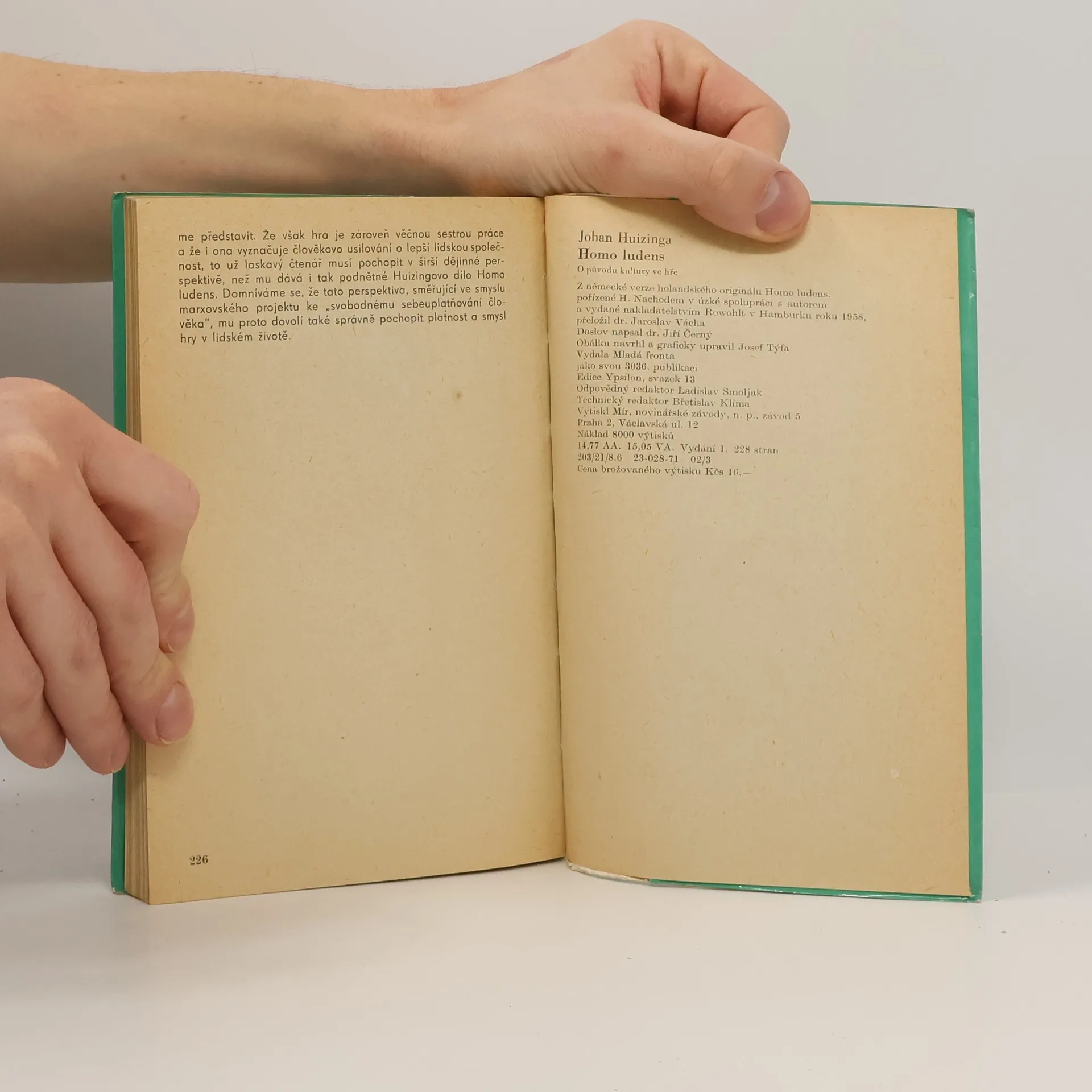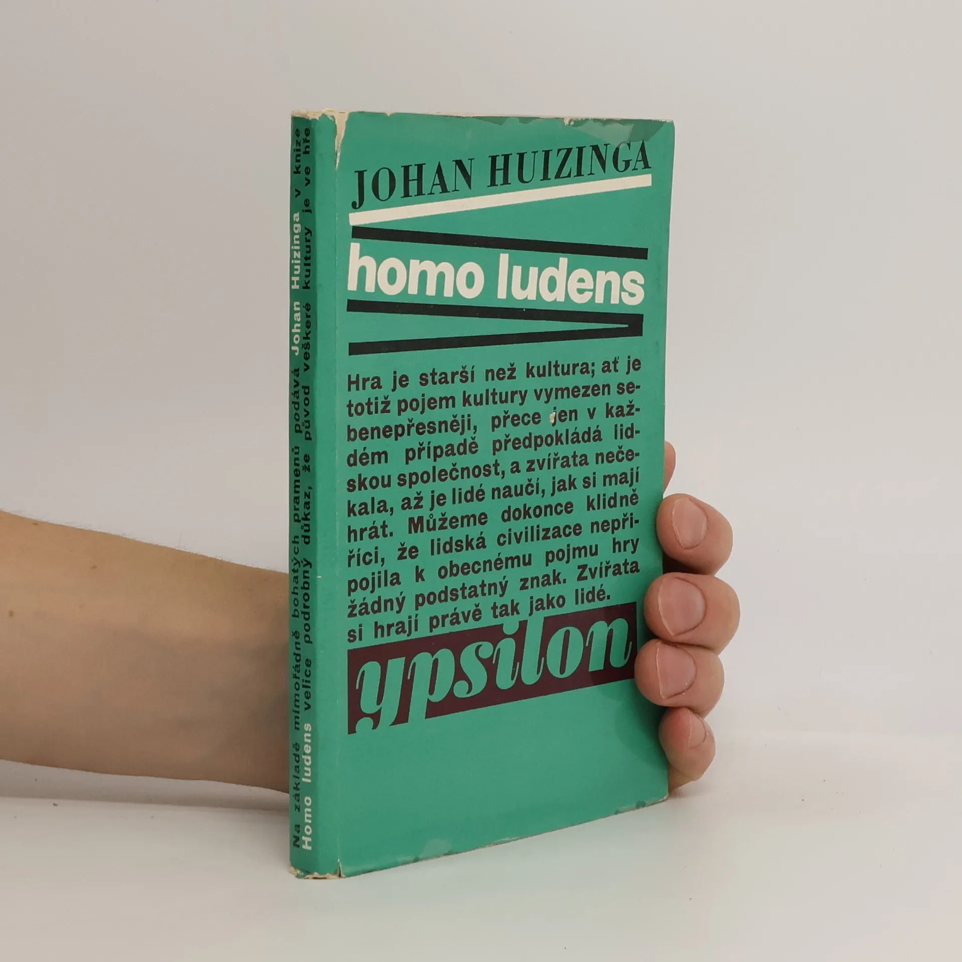 Vedle vlastní historiografie a historiografie kultury se Huizinga zabýval i oborem, který bychom dnes mohli nazvat kulturní sociologií či kulturní morfologií, to jest zkoumáním postupného zrání a utváření kultury. Huizingovo historické zaměření a koneckonců i jeho zájem o středověk a počátek novověku jsou ostatně patrné i v knize, která se nyní oprávněně dostává českému čtenáři do rukou: v knize nazvané Homo ludens - hrající si člověk, člověk ve hře. Dvojjediné téma „hry a kultury“, které se stalo hlavním námětem Huizingovy práce, je téma rozhodně přitažlivé; už samo sebou, ve svém spojení i ve svém vnitřním vztahu vzbudilo zaslouženou pozornost a našlo si dost následovníků. Tím zajímavější, že od samého počátku a od svých prvních podnětů, ač to tak možná nebylo ani myšleno, nezaujalo ani tak historiky či historiky kultury, jako spíše dalo podnět k vážnému zamyšlení nad tím, jako roli hrála a hraje v lidském životě vlastně hra. Úryvek z doslovu Jiřího Černého „Člověk a hra u Johana Huizingy.“