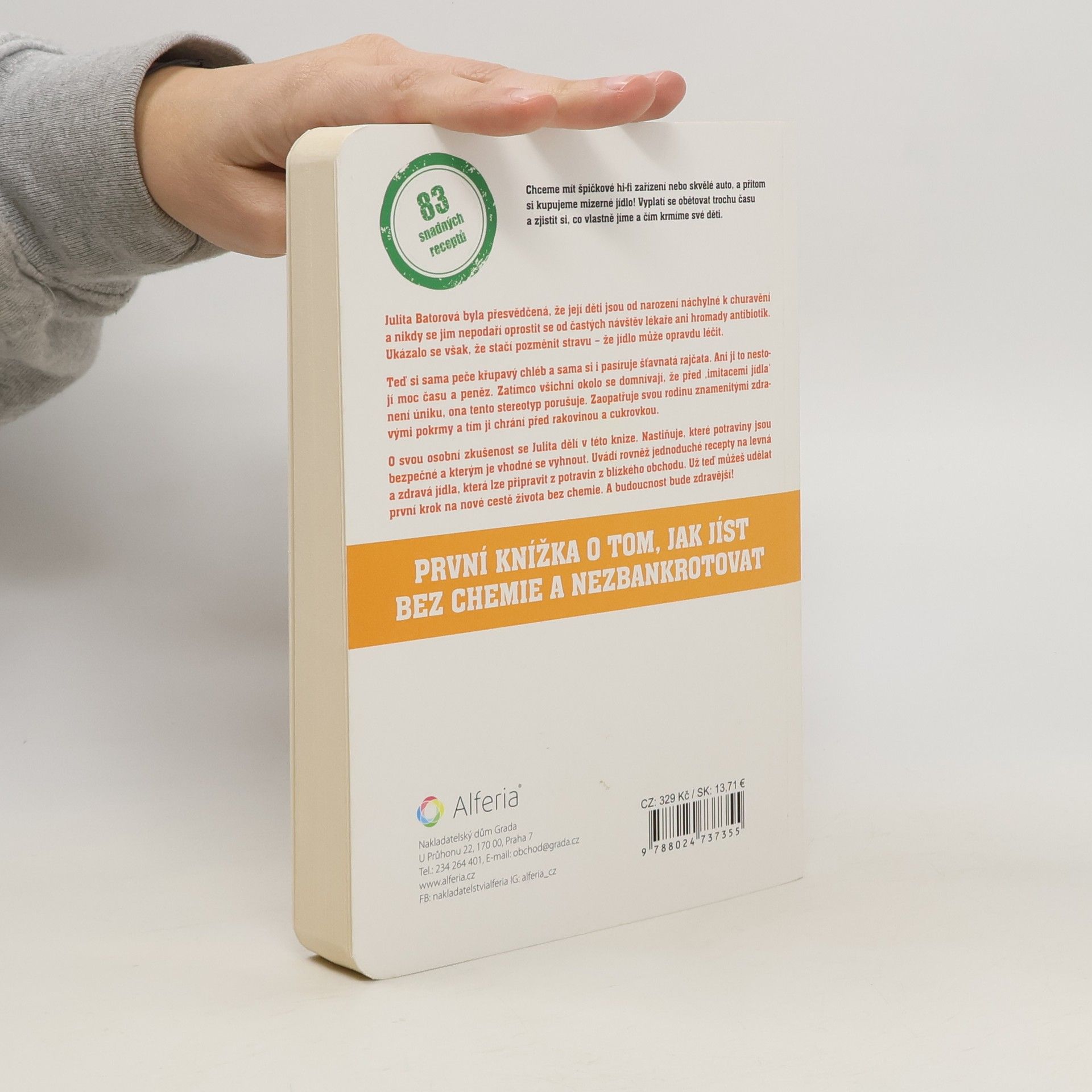 Julita Batorová si myslela, že její děti nedokáže nic úplně uzdravit a že se nikdy nezbaví alergií a častého užívání antibiotik. Ale ukázalo se, že stačí změnit stravu: jídlo může skutečně léčit! Teď si sama peče chléb i krájí šťavnatá rajčata. Nezabere jí to až tak moc času, ani to moc nestojí. Zatímco všichni kolem zastávají názor, že „produktům jídlupodobným“ se nedá uniknout, Julita tento stereotyp boří. Vaří své rodině chutně a zdravě, a tím i zajišťuje nejlepší prevenci před rakovinou nebo cukrovkou. O své zkušenosti se Julita dělí v této knížce. Vysvětluje, které produkty jsou bezpečné a kterých je lepší se vyvarovat. Sdílí recepty na nenákladná a zdravá jídla, která můžete uvařit z produktů dostupných v nejbližším obchodě. Teď hned se můžete vydat na cestu jezení bez chemie.