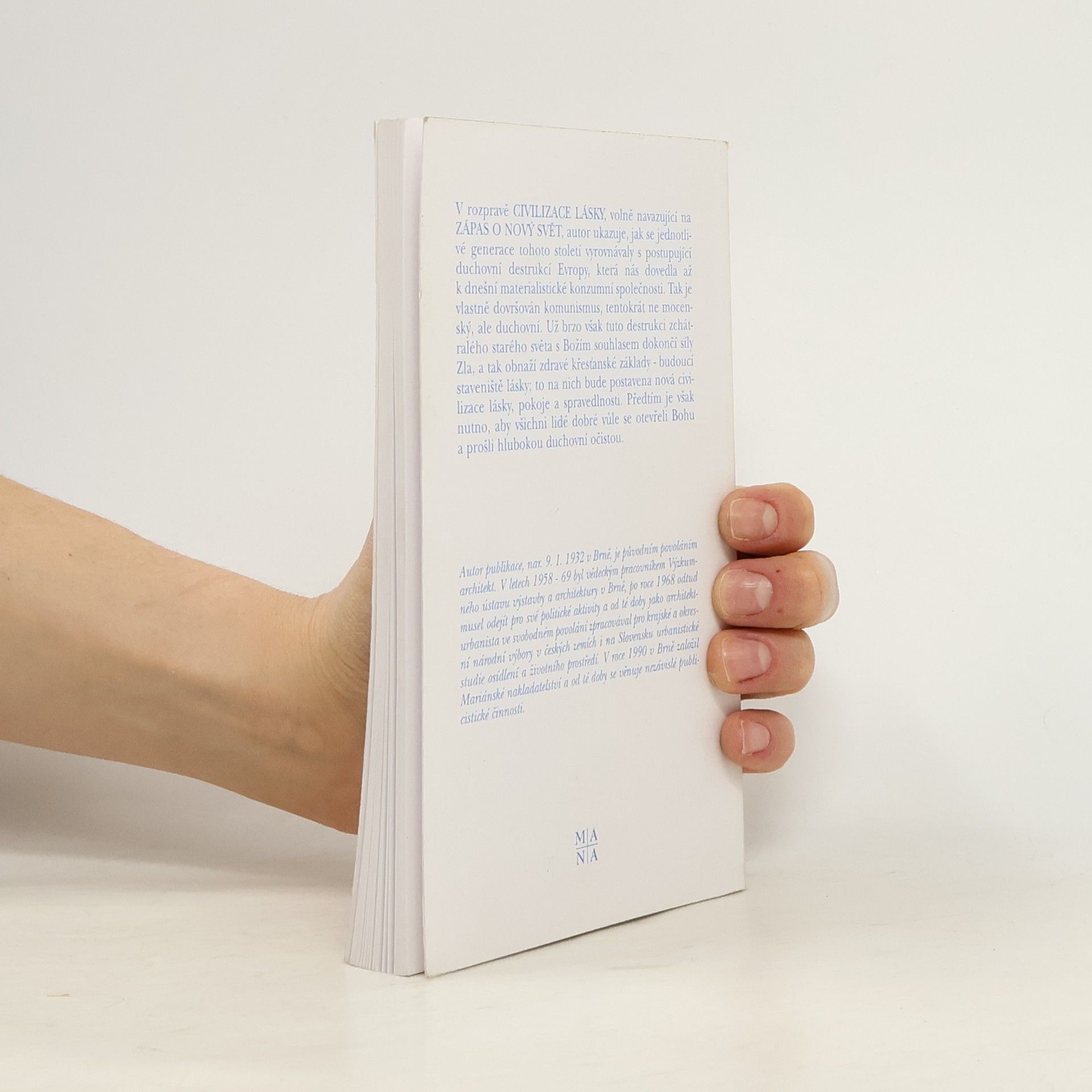 Druhá rozprava o smyslu dějin a člověkově poslání ve světě V rozpravě CIVILIZACE LÁSKY, volně navazující na ZÁPAS O NOVÝ SVĚT, autor ukazuje, jak se jednotlivé generace tohoto století vyrovnávaly s postupující duchovní destrukcí Evropy, která nás dovedla až k dnešní materialistické konzumní společnosti. Tak je vlastně dovršován komunismus, tentokrát ne mocenský, ale duchovní. Už brzo však tuto destrukci zchátralého starého světa s Božím souhlasem dokončí síly Zla, a tak obnaží zdravé křesťanské základy - budoucí staveniště lásky; to na nich bude postavena nová civilizace lásky, pokoje a spravedlnosti. Předtím je však nutno, aby všichni lidé dobré vůle se otevřeli Bohu a prošli hlubokou duchovní očistou.