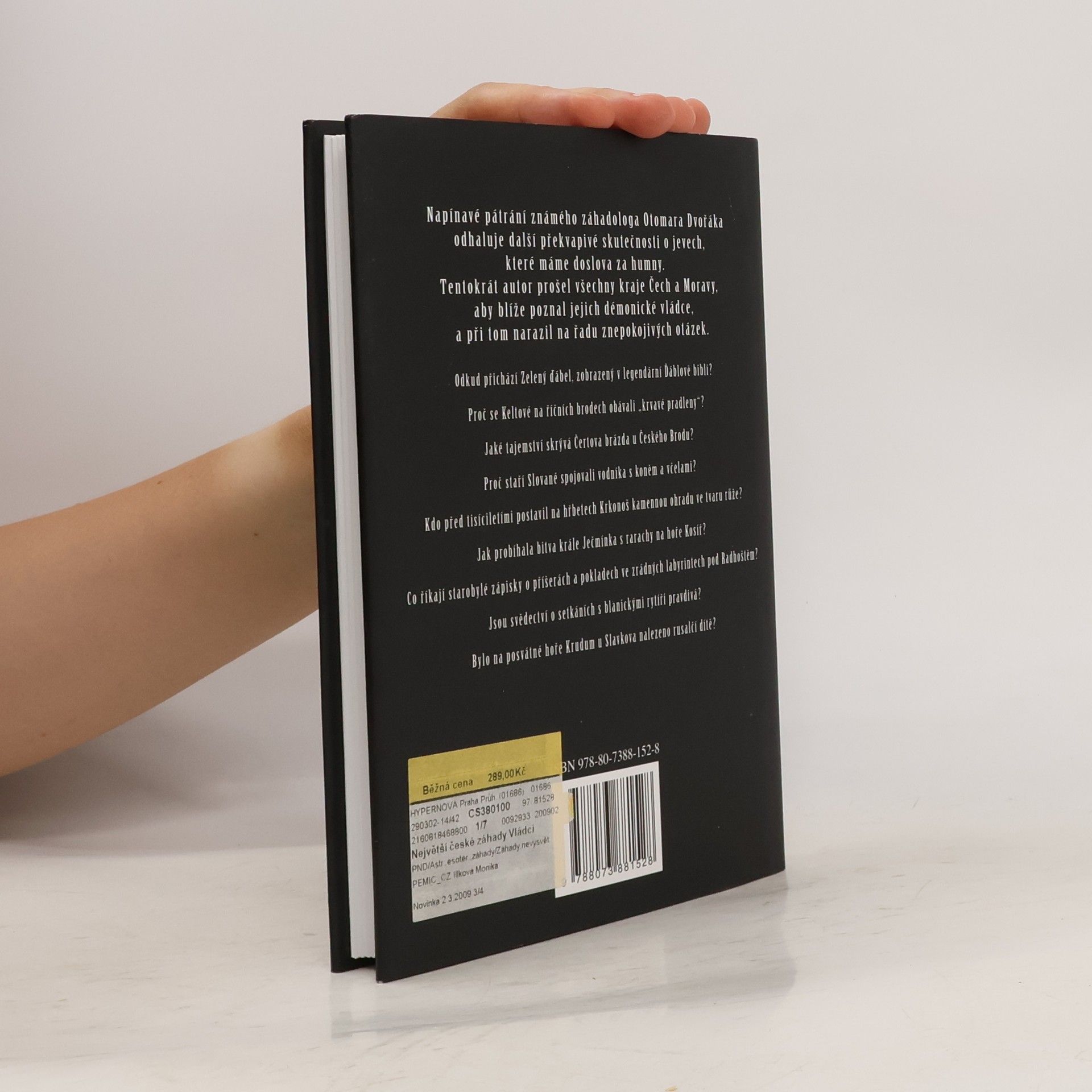 Napínavé pátrání známého záhadologa Otomara Dvořáka odhaluje další překvapivé skutečnosti o jevech, které máme doslova za humny. Tentokrát autor prošel všechny kraje Čech a Moravy, aby blíže poznal jejich démonické vládce, a při tom narazil na řadu znepokojivých otázek… Odkud přichází Zelený ďábel, zobrazený v legendární Ďáblově bibly? Proč se Keltové na říčních brodech obávali „krvavé pradleny“? Jaké tajemství skrývá Čertova brázda u Českého Brodu? Proč staří Slované spojovali vodníka s koněm a včelami? Kdo před tisíciletími postavil na hřbetech Krkonoš kamennou ohradu ve tvaru růže? Jak probíhala bitva krále Ječmínka s rarachy na hoře Kosíř? Co říkají starobylé zápisky o příšerách a pokladech ve zrádných labyrintech pod Radhoštěm? Jsou svědectví o setkáních s blanickými rytíři pravdivá? Bylo na posvátné hoře Krudum u Slavkova nalezeno rusalčí dítě?