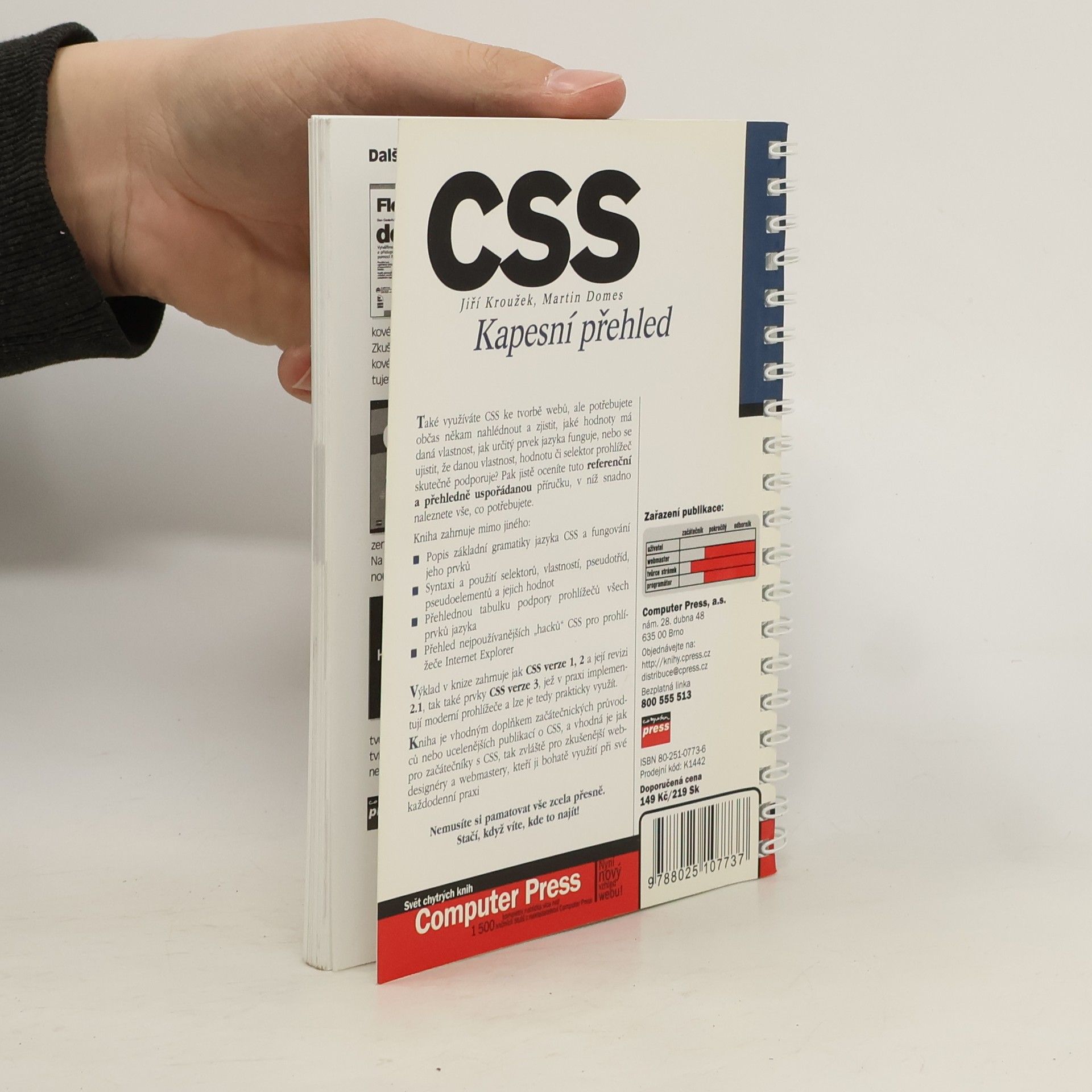 Referenční příručka CSS. KKniha je vhodným doplňkem začátečnických průvodců nebo ucelenějších publikací o CSS, a vhodná je jak pro začátečníky s CSS, tak zvláště pro zkušenější webdesignéry a webmastery, kteří ji bohatě využití při své každodenní praxi.