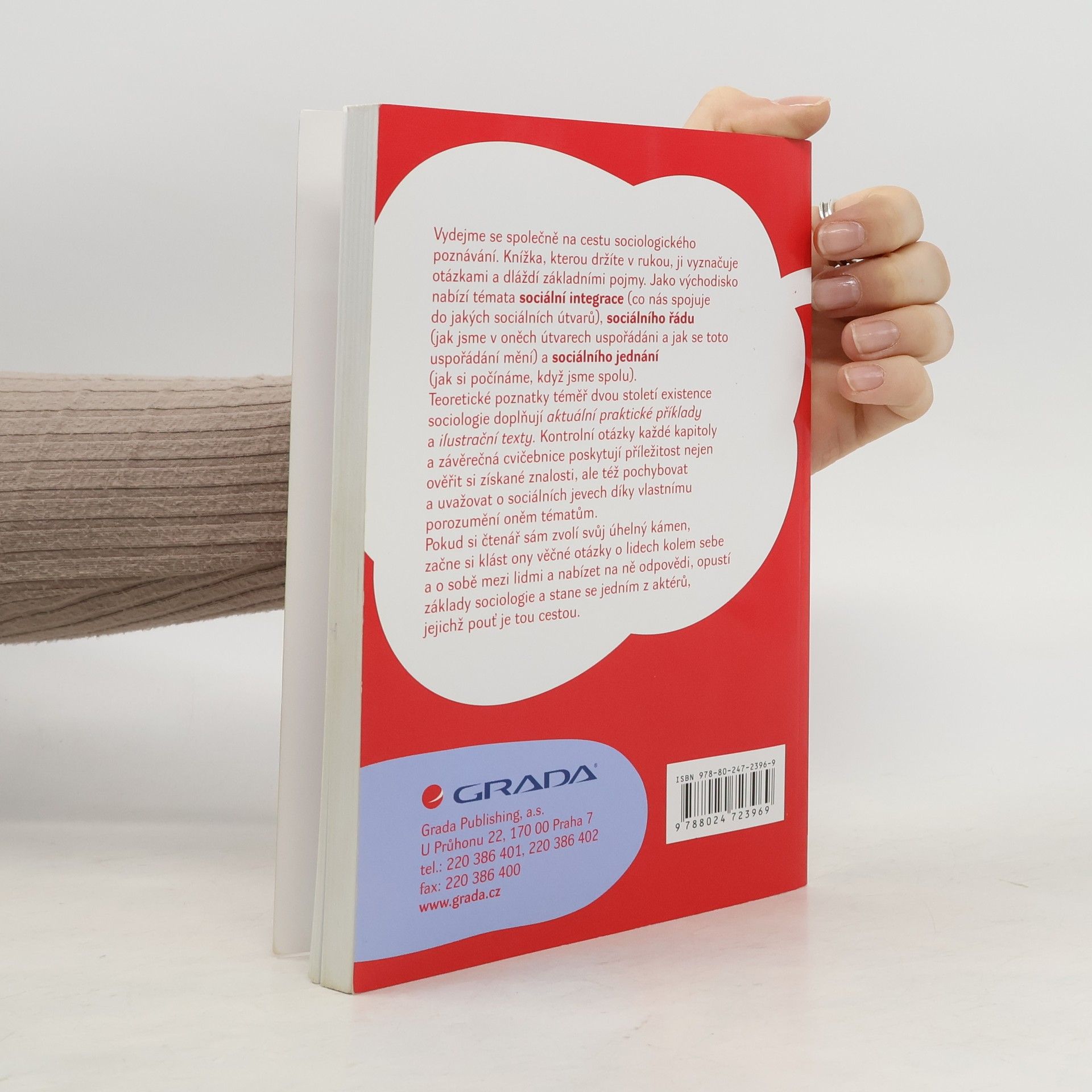 Přehledná publikace slouží jako základní text pro studenty příslušných oborů VŠ. Základy sociologie jsou zde představeny ve třech tématických na sebe navazujících blocích. Po úvodu, který seznamuje s předmětem sociologie a její metodou, jejím vznikem a vývojem, základními otázkami a paradigmaty, následuje blok věnovaný sociální integraci ústící v blok věnovaný sociálnímu uspořádání a v poslední blok věnovaný sociálnímu jednání.Jedná se o publikaci tzv. \'\'úvodu do studia\'\'. Její jedinečnost a atraktivnost pro studenty spočívá v tom, že v závěru každé kapitoly je uveden přehled pojmů a kontrolní otázky. Ke každé kapitole 1 - 12 náleží jedno cvičení ze cvičebnice v závěru publikace, jehož účelem je upevnění získaných znalostí.