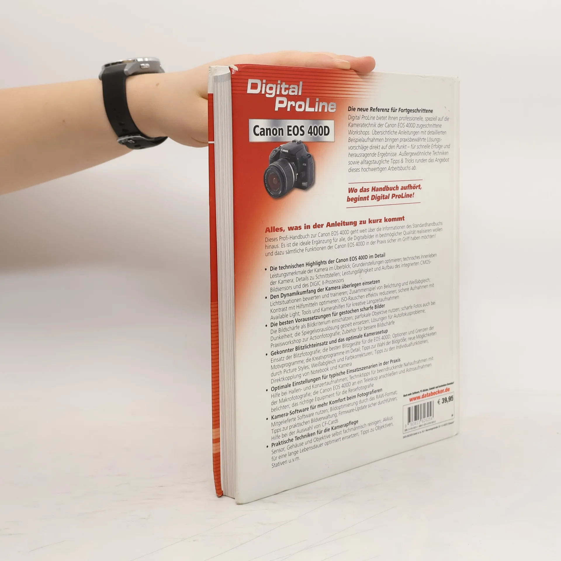Maximale Qualität herausholen§Mit Digital ProLine beherrschen Sie die Fähigkeiten Ihrer wertvollen Canon EOS 400D auch in Grenzsituationen sicher, denn die Reihe setzt dort an, wo die Originalanleitung des Herstellers aufhört. So kurz wie möglich und so ausführlich wie nötig zeigen Ihnen speziell auf Ihre digitale Spiegelreflexkamera zugeschnittene Workshops, wie Sie konkrete Anwendungsprobleme ohne Umwege lösen und immer das Maximum an Qualität aus Ihren Fotos herausholen. Detaillierte Beispielaufnahmen und kompakte Praxisanleitungen zu typischen Einsatzszenarien, Bildoptimierung, Kamerapflege u.a. bringen genau das auf den Punkt, was für ambitionierte Digitalfotografen wirklich wichtig ist.§§Kamera sicher beherrschen§Ob alltagstaugliche Grundeinstellungen, Hintergrundwissen zum technischen Innenleben der EOS 400D oder Informationen zu Bildschärfe, Kontrast und Belichtungssteuerung: In übersichtlich gestalteten Kapiteln bekommen interessierte Leser/innen anspruchsvolle Tricks und Kniffe, um die Kamera in allen erdenklichen Situationen sicher zu beherrschen. Außergewöhnliche Techniken, Tipps für den Kauf von Zubehör sowie zahlreiche Testcharts zum Abfotografieren runden das Angebot dieses hochwertigen Arbeitsbuchs ab.