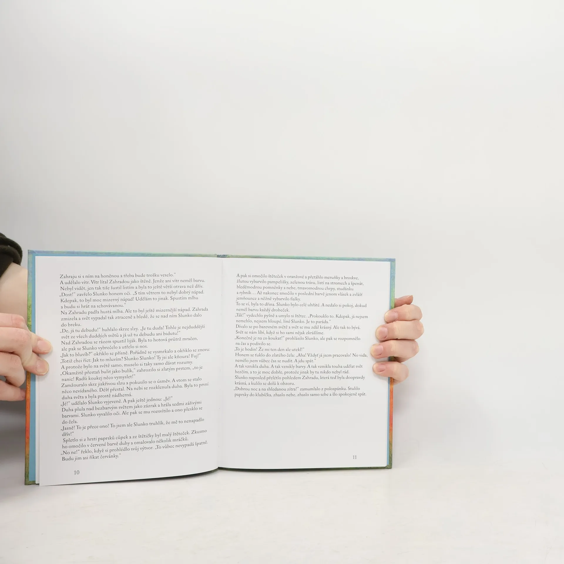 Sedm poetických pohádek o tom, jak si sluníčko pohraje s barvami a ze smutného, šedivého světa, udělá svět barevný a veselý. Kdysi dávno, když svět teprve vznikal, nebyly vůbec žádné barvy. To se ale Slunku příliš nelíbilo. Dívalo se z oblohy na ten nebarevný svět a nudilo se. Kouzelná duha mu však pomohla. Barvami duhy pomalovalo Slunko celý svět. Vznikly hvězdy a taky pihy, Slunko pomohlo na svět i malému kuřeti. A stalo se ještě mnoho dalšího. Při všech těch menších či větších zázracích se zrodila také láska, domluva, ochrana a péče, soucit, důvěra a legrace. Pohádky jsou proloženy básničkami. Celý text je doprovázen působivými ilustracemi Ireny Šafránkové. Knížka je určena především k předčítání dětem.