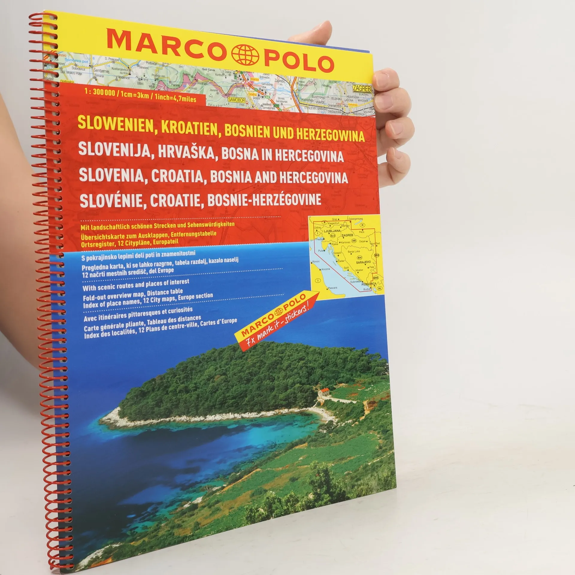 Marco Polo Atlases feature unique spiral binding with a wrap-around spine. The high quality cartography with distance indicators and scale converters aid route planning. A fold-out overview map is ideal for route planning and 7 self-adhesive Marco Polo mark-it stickers can be used to pin-point a destination or route for future reference. Scenic routes and places of interest are highlighted - ideal for touring holidays. They also contain a comprehensive index and inset street plans of major cities. The scale is 1:300 000.