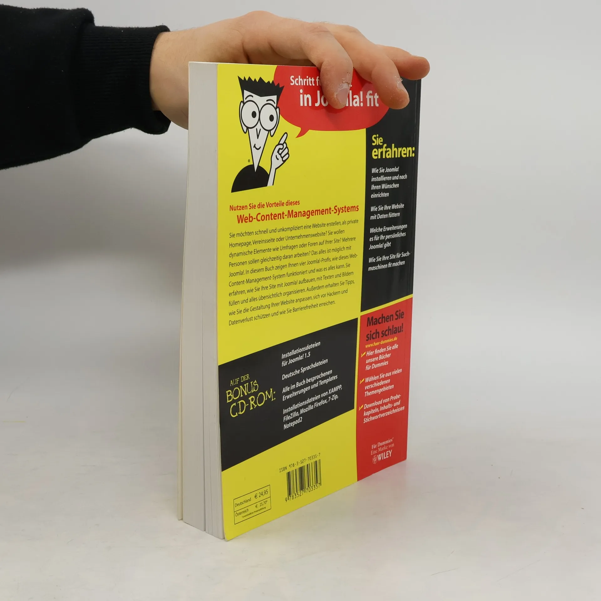 Schnell und unkompliziert Websites erstellen? Das geht dank des Web-Content-Management-Systems (CMS) Joomla!. In „Joomla! für Dummies“ zeigen vier Joomla!-Profis, was in diesem recht neuen Web-CMS steckt, wie es installiert, konfiguriert und mit Daten gefüttert wird. Neben den grundsätzlichen Dingen erfahren die Leser, wie man das Design mithilfe von Templates anpassen und aufpeppen kann. Zudem wird erklärt, wie sich die Website nach eigenen Wünschen erweitern lässt. Außerdem gehen die Autoren darauf ein, wie man sich und seine Website vor Hackerangriffen schützt, wie man Barrierefreiheit mit Joomla! erreicht und die eigene Website für Suchmaschinen optimiert. Auf der beiliegenden CD befinden sich die Joomla!-Version 1.5, Templates, Erweiterungen und alle Beispieldaten aus dem Buch.