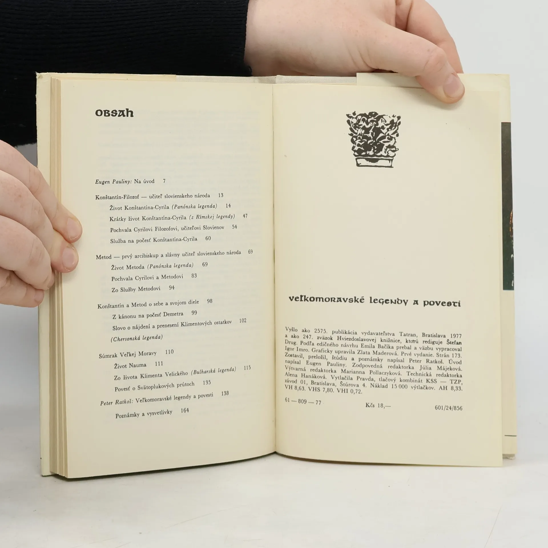 Kniha je psaná slovensky a z hojných archeologických nálezov sa dozvedáme o kmeňovom zriadení, spoločenskej organizácii a každodennom živote našich predkov na území Veľkej Moravy od piateho storočia. Pokresťančené slovanské obyvateľstvo urobilo významný kultúrny pokrok po príchode Konštantína a Metoda. Nemeckí historici a byzantskí analytici mlčia o politických dôsledkoch činnosti týchto vierozvestcov, čo robí pôvodné a preložené písomné pamiatky z tohto obdobia kľúčovými pre pochopenie našich dejín. Dielo, ktoré vyšlo vo vydavateľstve Tatran v Bratislave v roku 1990, je súborným vydaním literárnych pamiatok z čias Veľkej Moravy, zostavené významným slovenským historikom Petrom Ratkošom. Úvodnú esej napísal jazykovedec Eugen Pauliny. Súbor sa zameriava na literárne dielo solúnskych bratov sv. Cyrila a sv. Metoda, ktorí sú buď autormi alebo predmetom literárneho stvárnenia. Prekladateľ rozdelil dielo na štyri kapitoly, vrátane životopisných legiend o oboch bratoch, ako sú Panónska a Rímska legenda. Ratkoš uvádza, že legendy sú súčasťou literárnej tvorby veľkomoravského učilišťa a potvrdzujú vysokú kultúrnosť našich predkov. Hoci názvy "legenda" a "povesť" môžu naznačovať nepresnosti, historická dôveryhodnosť týchto textov je nespochybniteľná.