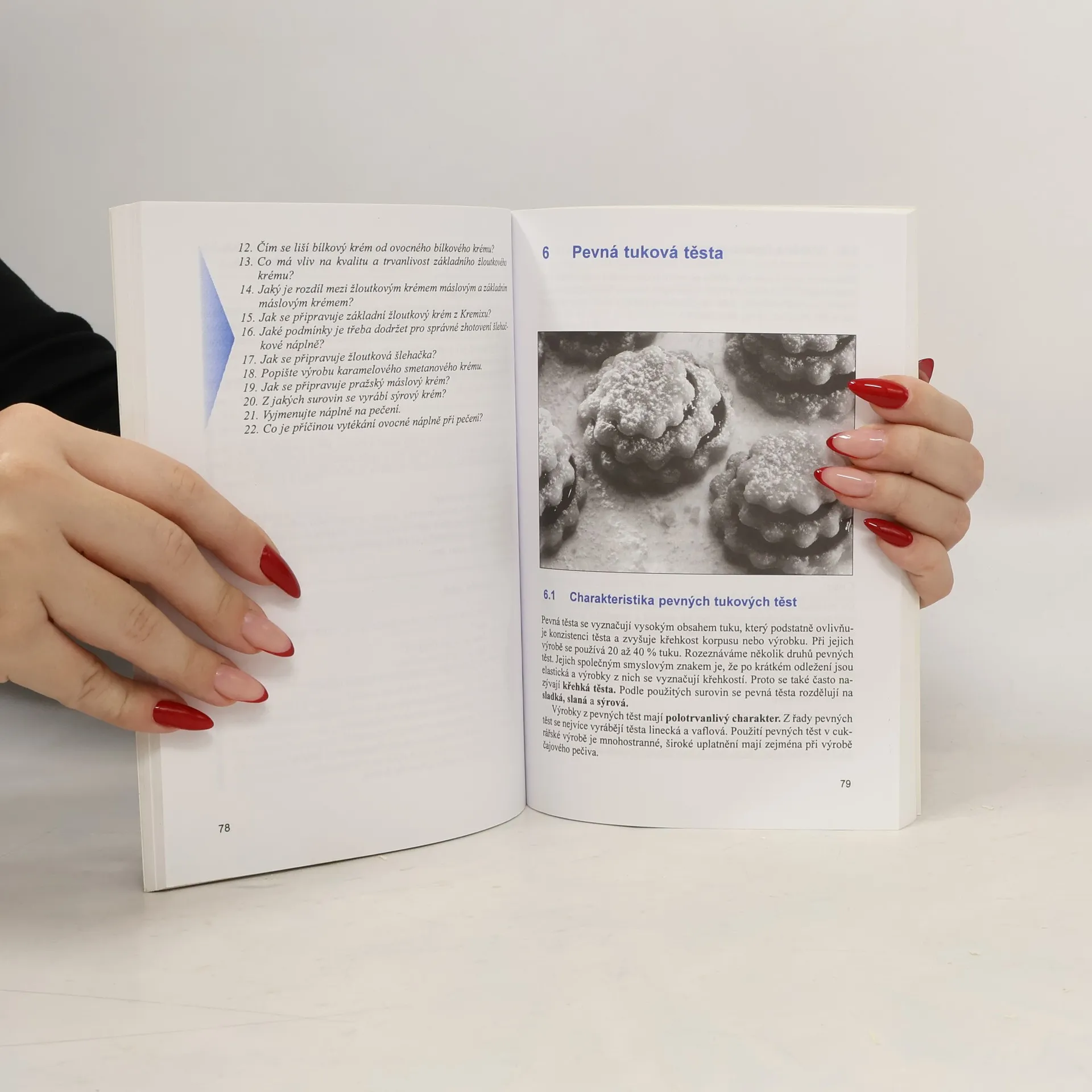 Propočty surovinových norem, úprava cukru vařením, polevy, náplně, pevná tuková těsta, třená linecká těsta, pálená hmota, listové těsto, koloidy.
