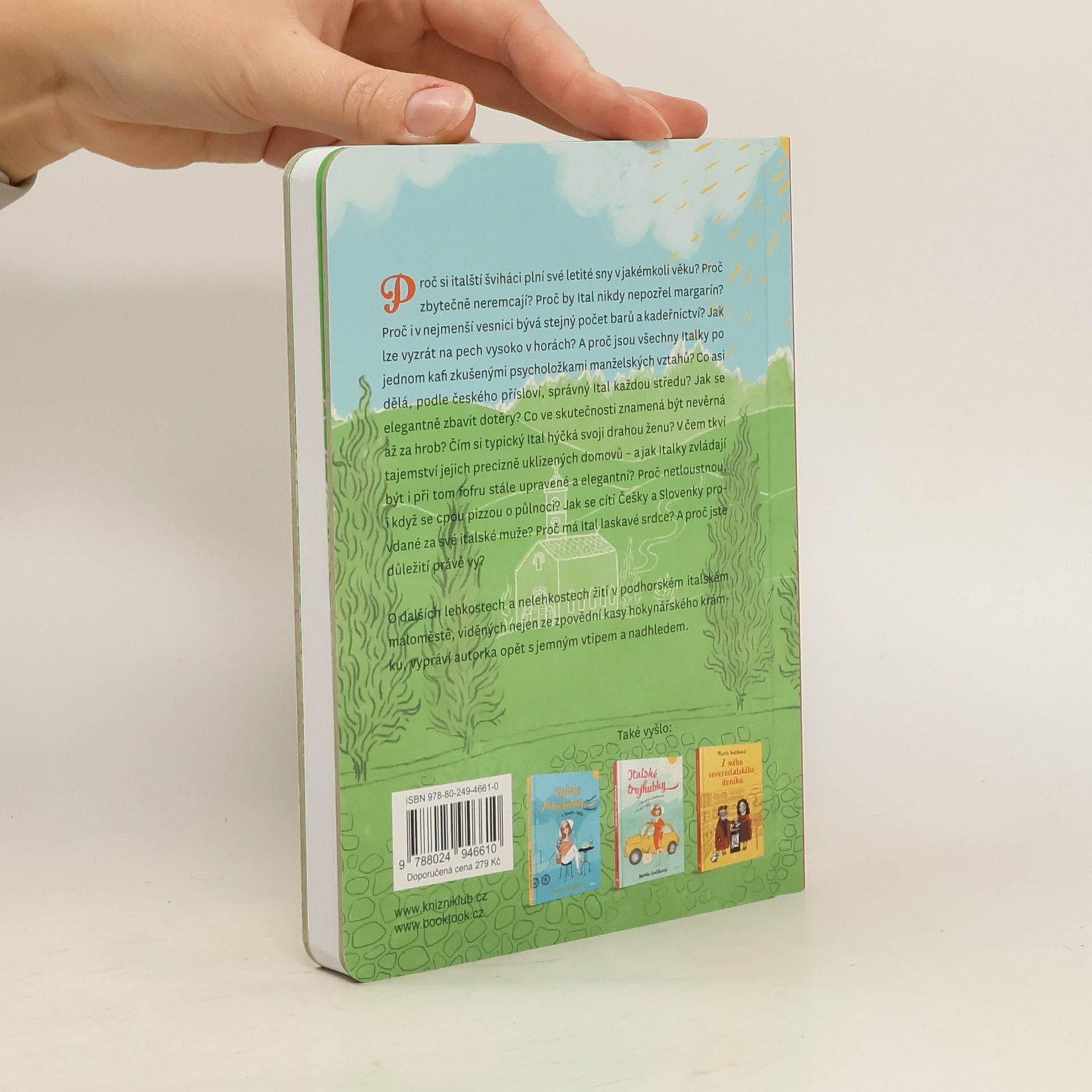 Proč si italští šviháci plní své letité sny v jakémkoli věku? Proč zbytečně neremcají? Proč by Ital nikdy nepozřel margarín? Proč i v nejmenší vesnici bývá stejný počet barů a kadeřnictví? Jak lze vyzrát na pech vysoko v horách? A proč jsou všechny Italky po jednom kafi zkušenými psycholožkami manželských vztahů? Co asi dělá, podle českého přísloví, správný Ital každou středu? Jak se elegantně zbavit dotěry? Co ve skutečnosti znamená být nevěrná až za hrob? Čím si typický Ital hýčká svoji drahou ženu? V čem tkví tajemství jejich precizně uklizených domovů – a jak Italky zvládají být i při tom fofru stále upravené a elegantní? Proč netloustnou, i když se cpou pizzou o půlnoci? Jak se cítí Češky a Slovenky provdané za své italské muže? Proč má Ital laskavé srdce? A proč jste důležití právě VY? O dalších lehkostech a nelehkostech žití v podhorském italském maloměstě, viděných nejen ze zpovědní kasy hokynářského krámku, vypráví autorka, žijící v těchto končinách téměř patnáct let, opět s jemným vtipem a nadhledem.