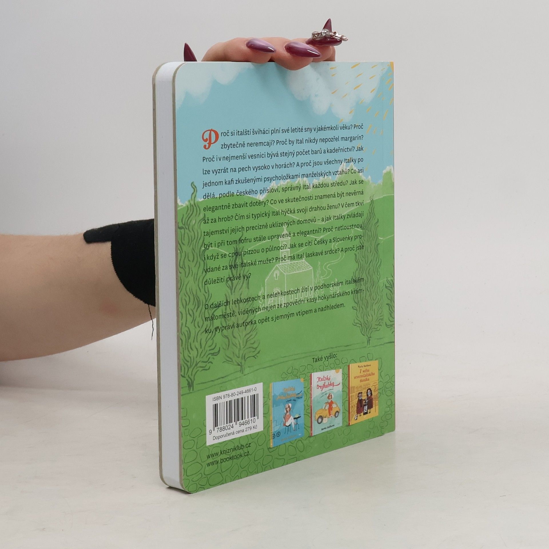 Proč si italští šviháci plní své letité sny v jakémkoli věku? Proč zbytečně neremcají? Proč by Ital nikdy nepozřel margarín? Proč i v nejmenší vesnici bývá stejný počet barů a kadeřnictví? Jak lze vyzrát na pech vysoko v horách? A proč jsou všechny Italky po jednom kafi zkušenými psycholožkami manželských vztahů? Co asi dělá, podle českého přísloví, správný Ital každou středu? Jak se elegantně zbavit dotěry? Co ve skutečnosti znamená být nevěrná až za hrob? Čím si typický Ital hýčká svoji drahou ženu? V čem tkví tajemství jejich precizně uklizených domovů – a jak Italky zvládají být i při tom fofru stále upravené a elegantní? Proč netloustnou, i když se cpou pizzou o půlnoci? Jak se cítí Češky a Slovenky provdané za své italské muže? Proč má Ital laskavé srdce? A proč jste důležití právě VY? O dalších lehkostech a nelehkostech žití v podhorském italském maloměstě, viděných nejen ze zpovědní kasy hokynářského krámku, vypráví autorka, žijící v těchto končinách téměř patnáct let, opět s jemným vtipem a nadhledem.