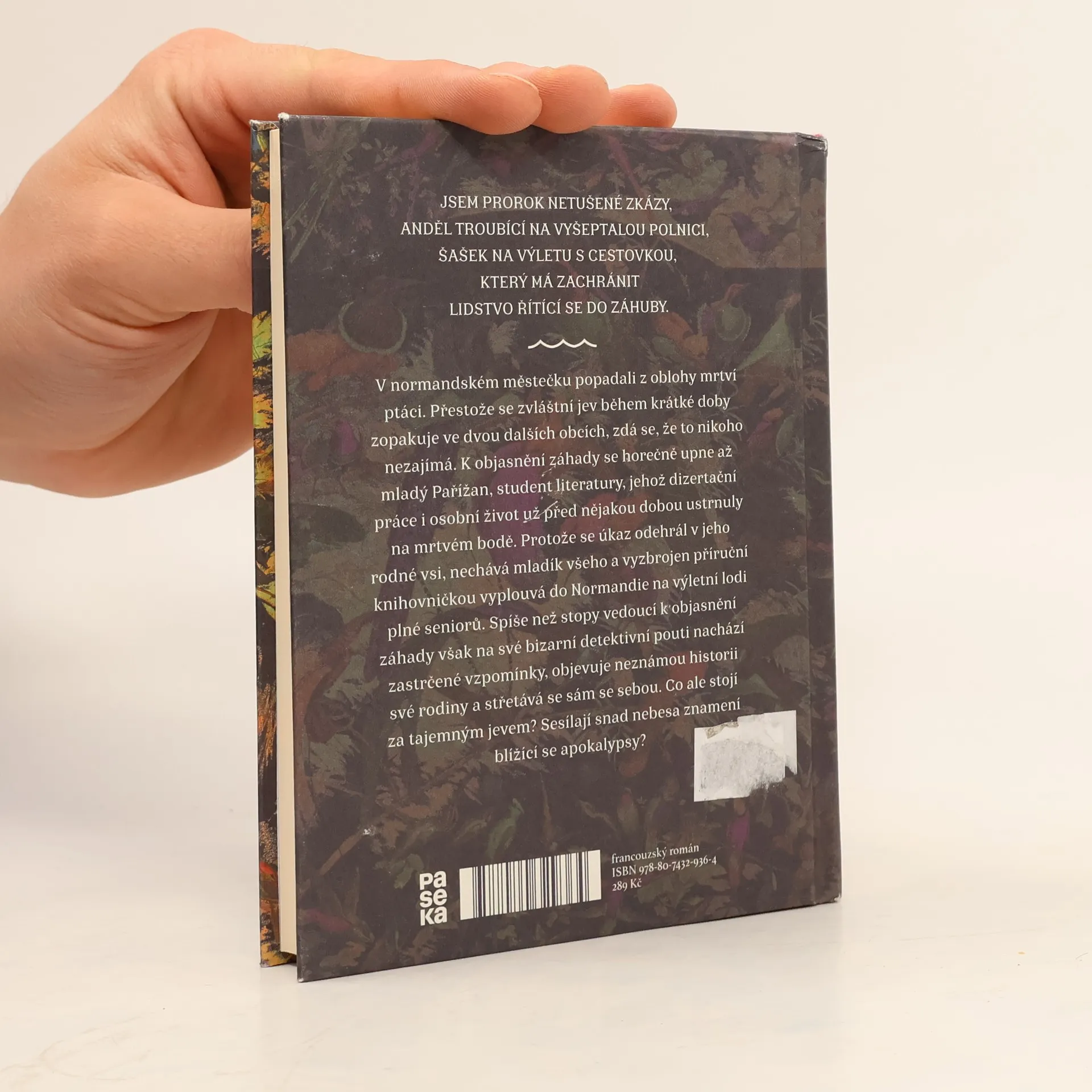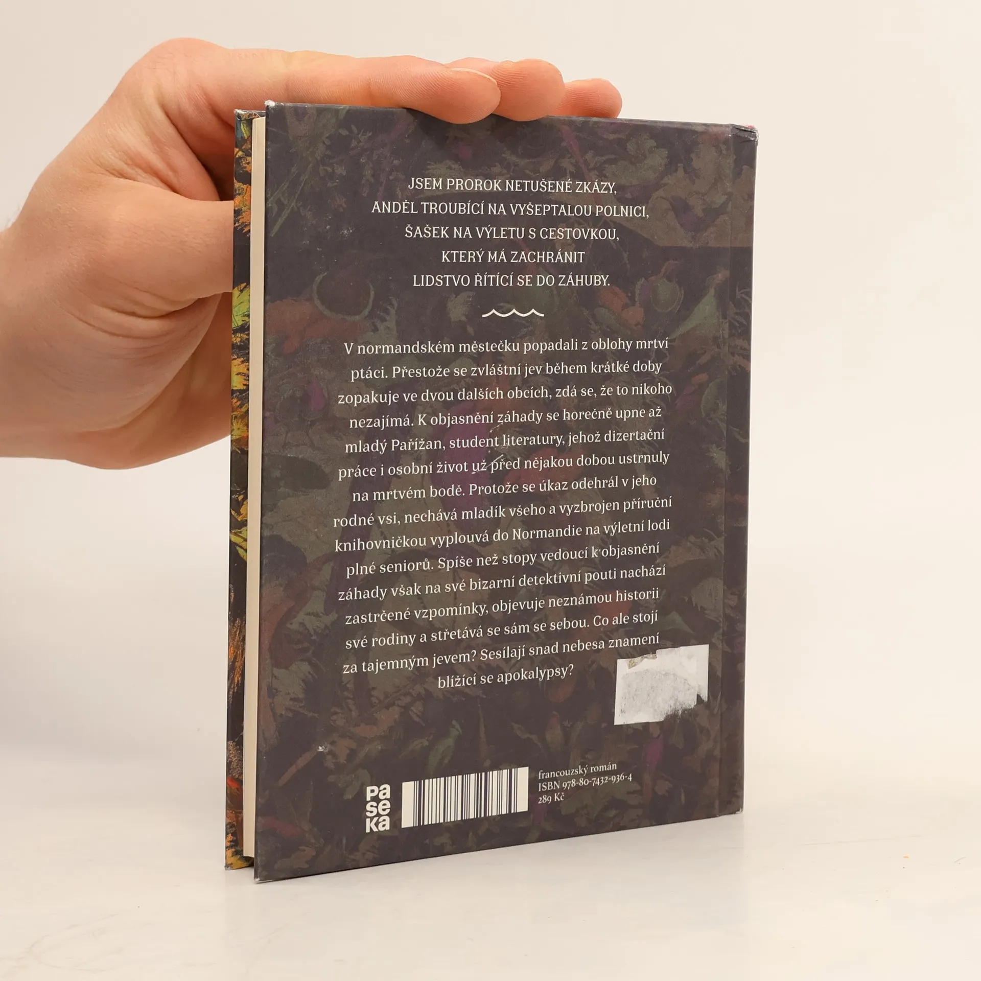 V normandském městečku popadali z oblohy mrtví ptáci. Přestože se zvláštní jev během krátké doby zopakuje ve dvou dalších obcích, zdá se, že to nikoho nezajímá. K objasnění záhady se horečně upne až mladý Pařížan, student literatury, jehož disertační práce i osobní život už před nějakou dobou ustrnuly na mrtvém bodě. Protože se úkaz odehrál v jeho rodné vsi, nechává mladík všeho a vyzbrojen příruční knihovničkou vyplouvá do Normandie na výletní lodi plné seniorů. Spíše než stopy vedoucí k objasnění záhady však na své bizarní detektivní pouti nachází vzpomínky, objevuje neznámou historii své rodiny a střetává se sám se sebou. Co ale stojí za tajemným jevem? Sesílají snad nebesa znamení blížící se apokalypsy?