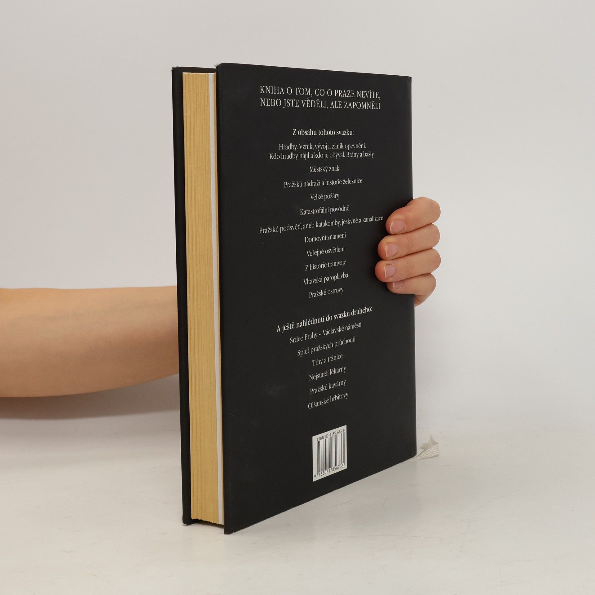 Dvousvazková reedice původního vydání z roku 1939 poskytuje milovníkům Prahy neobvyklé pohledy na město a jeho historii. Ukazuje Prahu, jak ji Pražané neznají, co jim každodením stykem zevšednělo, co je však při "novém osvětlení staré věci přímo skoro uhodí přes oči", jak je obdivuhodná a jak úzce je spojena s osudem celého národa. První svazek popisuje historii hradeb, znaku města, nádraží, kanalizace, domovních znamení, osvětlení, tramvajové dopravy, paroplavby, městského osvětlení a ostrovů, pojednává o požárech a velkých povodních .