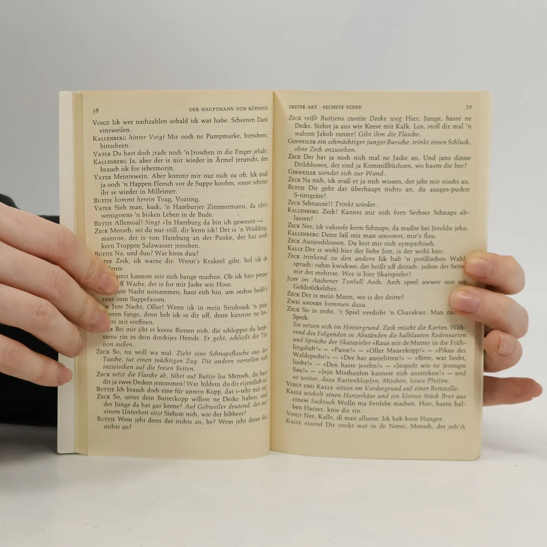 "Ein als Hauptmann verkleideter Mensch führte gestern eine von Tegel kommende Abteilung Soldaten nach dem Köpenicker Rathaus, ließ den Bürgermeister verhaften, beraubte die Gemeindekasse und fuhr in einer Droschke davon." So zu lesen am 17. Oktober 1906 in den Berliner Zeitungen. Dieser Mensch hieß Wilhelm Voigt. In jungen Jahren war der Schustergeselle aus Not mit dem Gesetz in Konflikt geraten. 15 Jahre Zuchthaus waren die Strafe dafür, daß er die Reichspost um 300 Mark geschädigt hatte: Er geriet in den Teufelskreis der Bürokratie. Ohne ordentliche Abmeldung fand er nirgends Arbeit, ohne Arbeitsnachweis erhielt er keine Anmeldung. Voigt wird wieder straffällig; mit 56 Jahren hat er mehr als 30 Jahre seines Lebens im Zuchthaus verbracht. In diesem Augenblick seines Lebens stößt er auf jene Uniform im Trödlerladen in der Berliner Grenadierstraße, die von nun an sein weiteres Schicksal bestimmen wird.Dieses Deutsche Märchen erschien zum erstenmal 1931; es ist heute eines der bekanntesten Stücke Zuckmayers. Die Verfilmung, mit Heinz Rühmann in der Hauptrolle, ist vielen Zuschauern unvergeßlich.