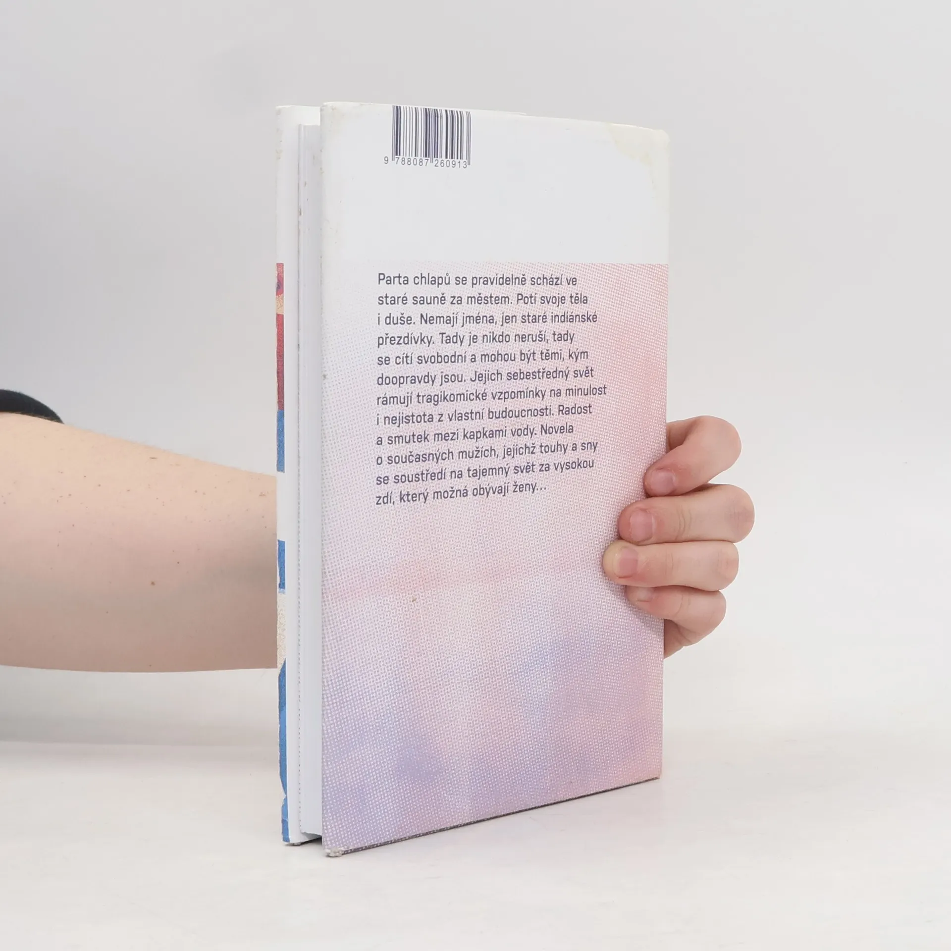 Parta chlapů se pravidelně schází ve staré sauně za městem. Potí svoje těla i duše. Nemají jména, jen staré indiánské přezdívky. Tady je nikdo neruší, tady se cítí svobodní a mohou být těmi, kým doopravdy jsou. Jejich sebestředný svět rámují tragikomické vzpomínky na minulost i nejistota z vlastní budoucnosti. Radost a smutek mezi kapkami vody. Novela o současných mužích, jejichž touhy a sny se soustředí na tajemný svět za vysokou zdí, který možná obývají ženy…