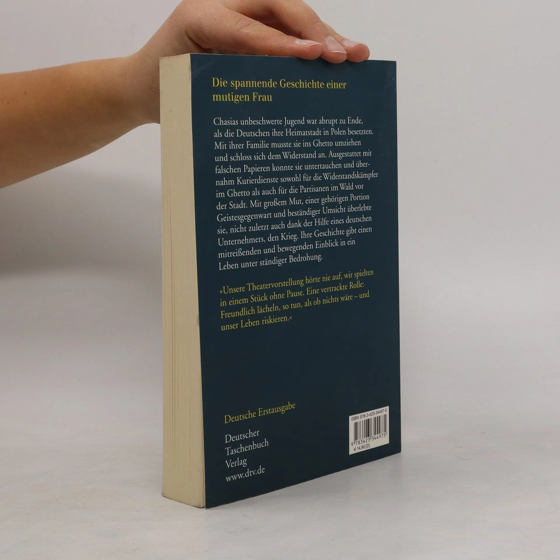 Chasia wuchs in Grodno (damals Polen, heute Weißrussland) auf und durchlebte eine behütete Kindheit und Jugend. Nach dem Einmarsch der Deutschen in den sowjetisch besetzten Teil Polens 1941 wurde sie mit ihren Eltern und Geschwistern ins Ghetto gesperrt. Sie schloss sich dem Widerstand an und wurde mit falschen Papieren in die Stadt Bialystok gesandt, wo sie getarnt als polnisches Dienstmädchen untertauchte. Zusammen mit einigen anderen jungen Frauen übernahm sie Kurier- und Spitzeldienste für die jüdischen Widerstandskämpfer im Ghetto und die Partisanen in den Wäldern nahe der Stadt. Chasia überlebte, nicht zuletzt dank der Hilfe eines deutschen Unternehmers, den Krieg. Die anschauliche und gefühlvolle Schilderung ihrer Erlebnisse gibt einen sehr plastischen Einblick in das Leben unter ständiger Bedrohung. »Unsere Theatervorstellung hörte nie auf, wir spielten in einem Stück ohne Pause. Eine vertrackte Rolle: freundlich lächeln, so tun, als ob nichts wäre - und unser Leben riskieren.«