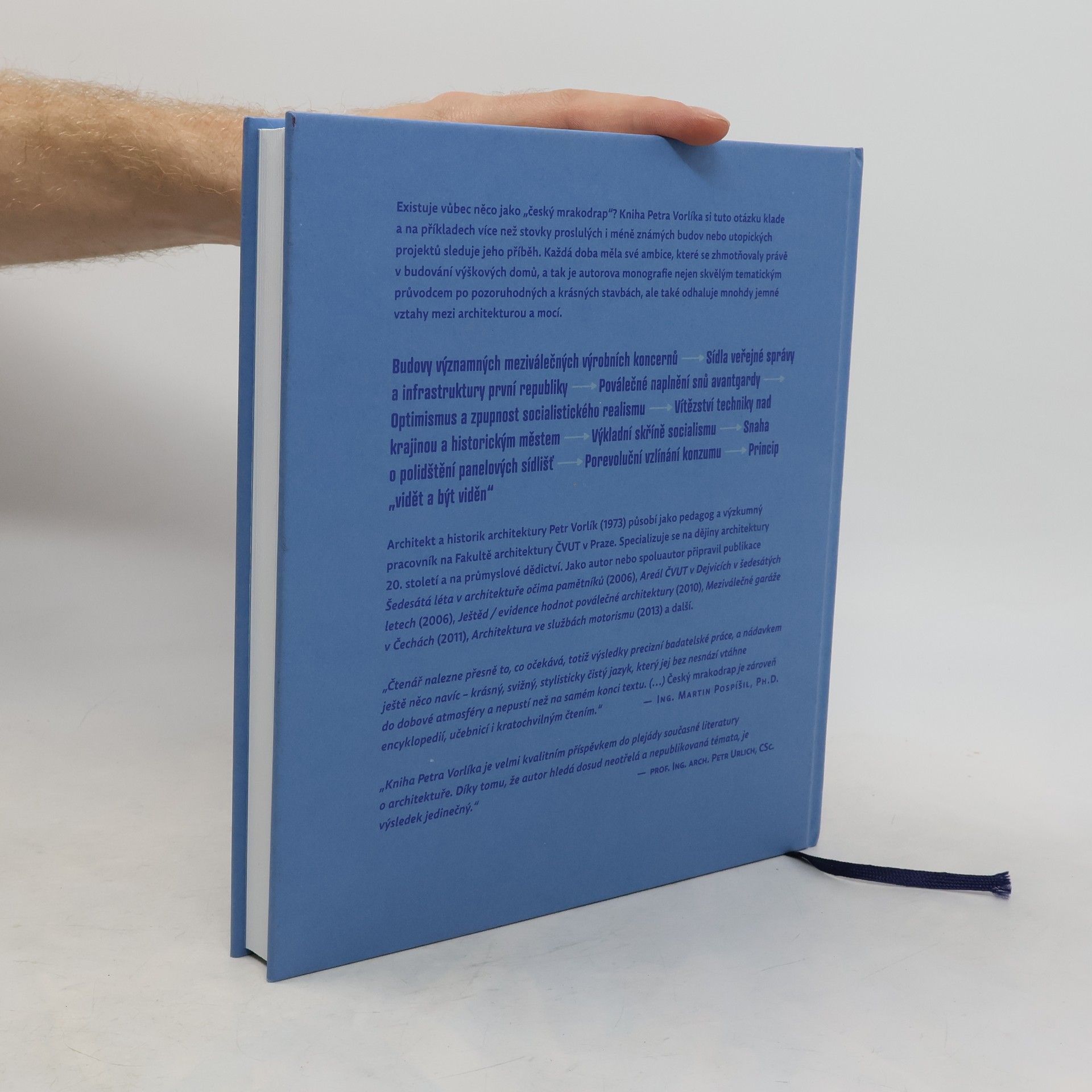 Existuje vůbec něco jako „český mrakodrap“? Kniha Petra Vorlíka sleduje na příkladech více než stovky proslulých i méně známých staveb nebo utopických projektů příběh skromného českého mrakodrapu. Zachycuje např.budovy významných meziválečných výrobních koncernů, sídel veřejné právy a infrastruktury pokrokové republiky, poválečné naplnění snů avantgardy, nekritický optimismus, ale i zpupnost socialistického realismu, vítězství techniky nad krajinou a historickým městem, prominentní výkladní skříně socialismu, snahu o polidštění jednotvárných panelových sídlišť i porevoluční vzlínání konzumu a principu „vidět a být viděn“. Každá doba měla své ambice, které se mnohdy zhmotnily právě v budování výškových staveb. Na příkladech jednotlivých výškových budov lze tedy oukázat na mnohdy jemné vztahy mezi mocí a architekturou.