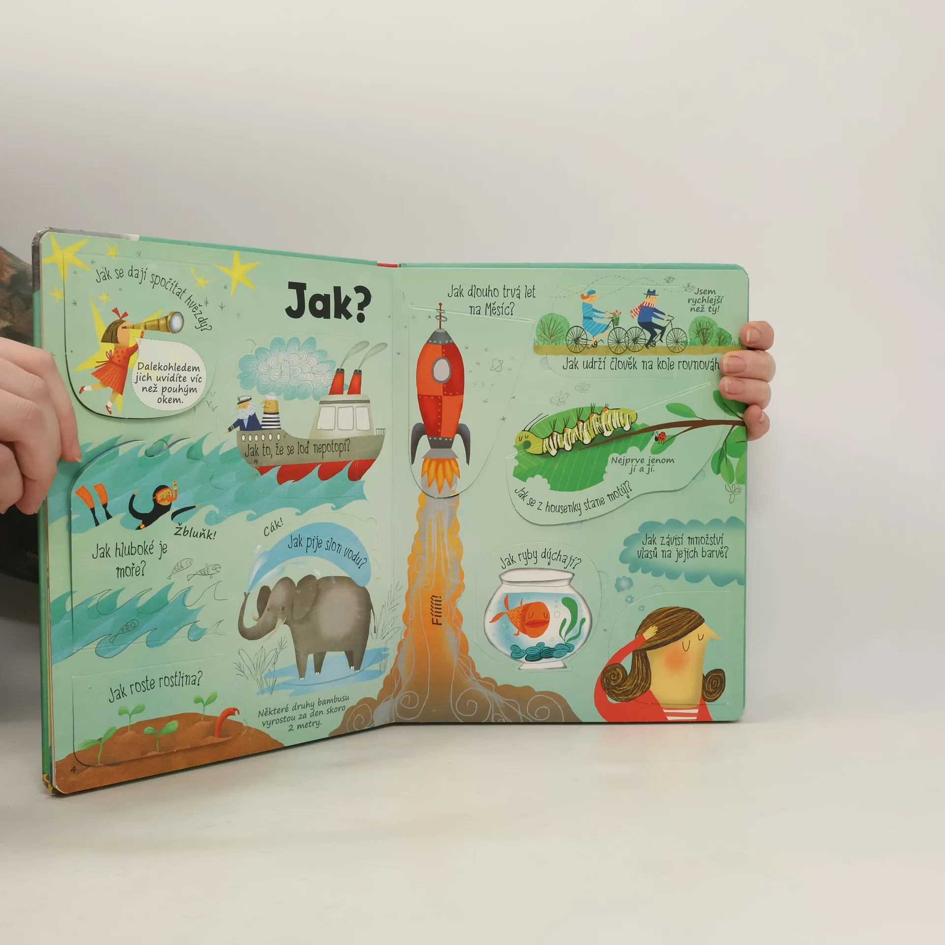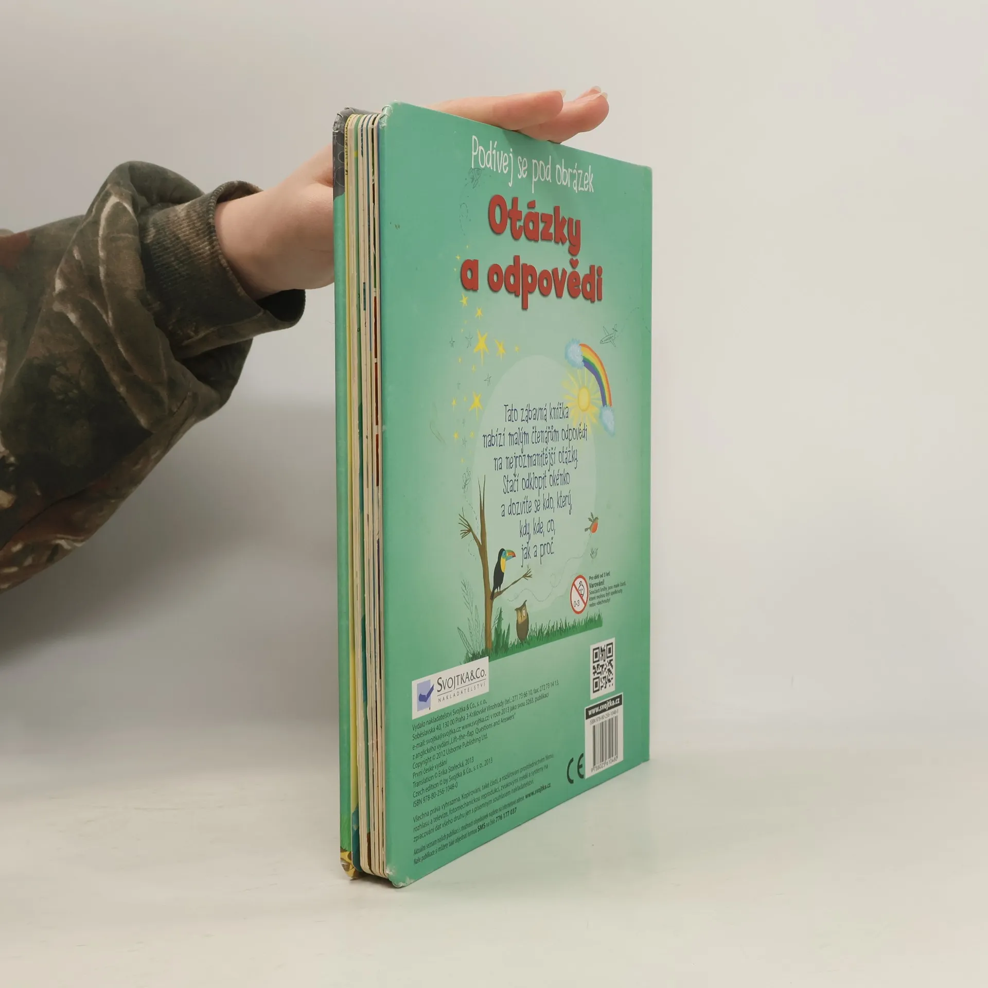 Kdy, jak, kde, kdo, proč, který, co? Na všechny tyhle otázky (celkem je jich 75) dostanete uvnitř knížky odpovědi. Najdete tam pěkné obrázky, stačí je odklopit a budete zas o něco chytřejší než dosud. Abych nezapomněla – těch otvíracích okének je něco přes šedesát.