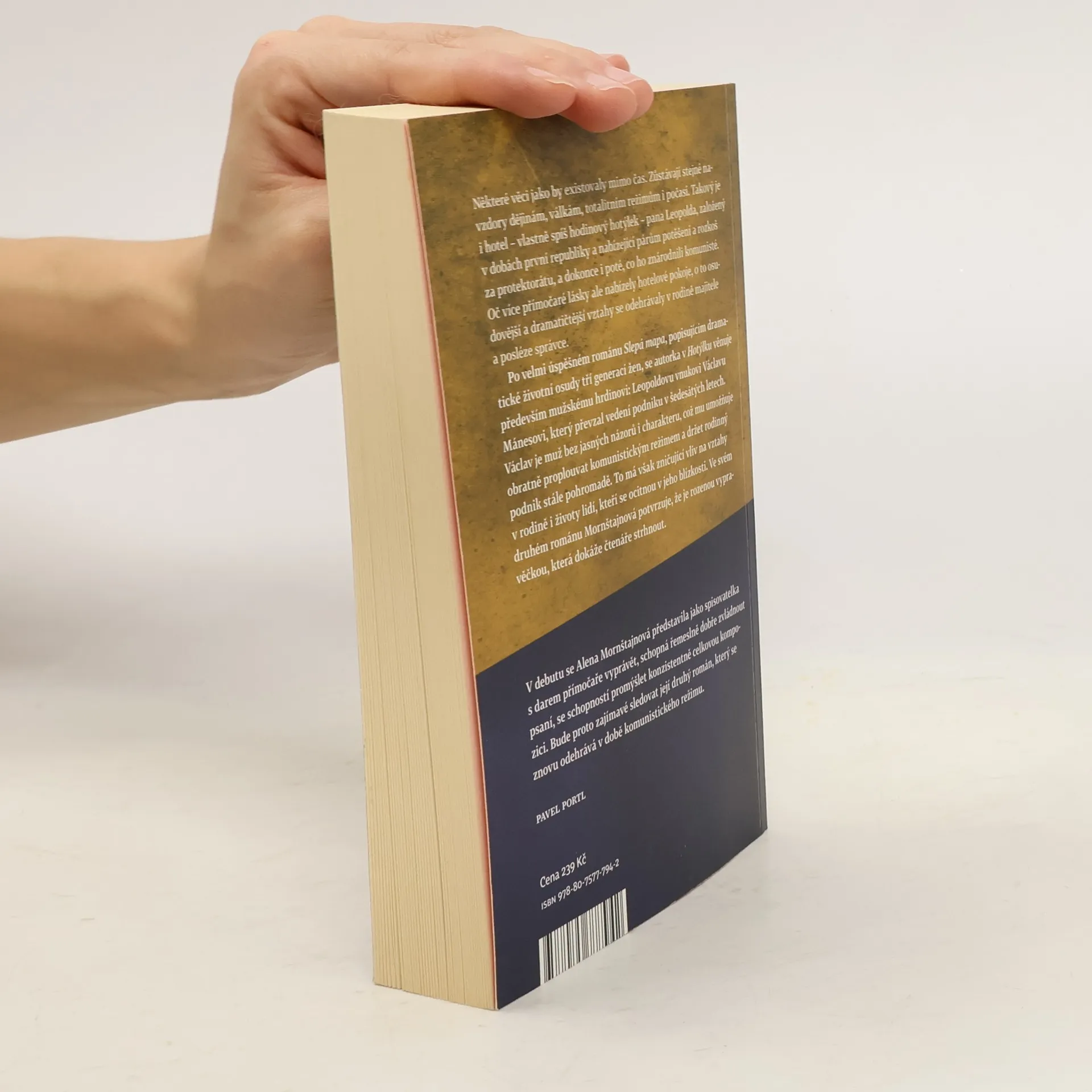 Některé věci jakoby existovaly mimo čas. Zůstávají stejné navzdory dějinám, válkám, totalitním režimům i počasí. Takový je i hotel pana Leopolda, vlastně spíše hodinový hotýlek, založený v dobách první republiky a nabízející potěšení a rozkoš párům za protektorátu, a dokonce i poté, co ho znárodnili komunisté. Oč více přímočaré lásky ale nabízely hotelové pokoje, o to osudovější a dramatičtější vztahy se odehrávaly v rodině majitele a posléze správce. Po velmi úspěšném románu Slepá mapa popisujícím dramatické životní osudy tří generací žen se v nové knize autorka věnuje především postavě jediné: Leopoldovu vnukovi Václavu Mánesovi, který převzal vedení podniku v šedesátých letech. Václav je muž bez vlastností, jasných názorů i charakteru, což mu umožňuje obratně proplouvat komunistickým režimem a držet rodinný podnik stále pohromadě, má však zničující vliv na vztahy v rodině i životy lidí, kteří se ocitnou v jeho blízkosti. Mornštajnová popisuje a vysvětluje Václavovy skutky tak obratně, že se teprve na konci knihy zděsíme, komu jsme to vlastně po celou dobu drželi palce.