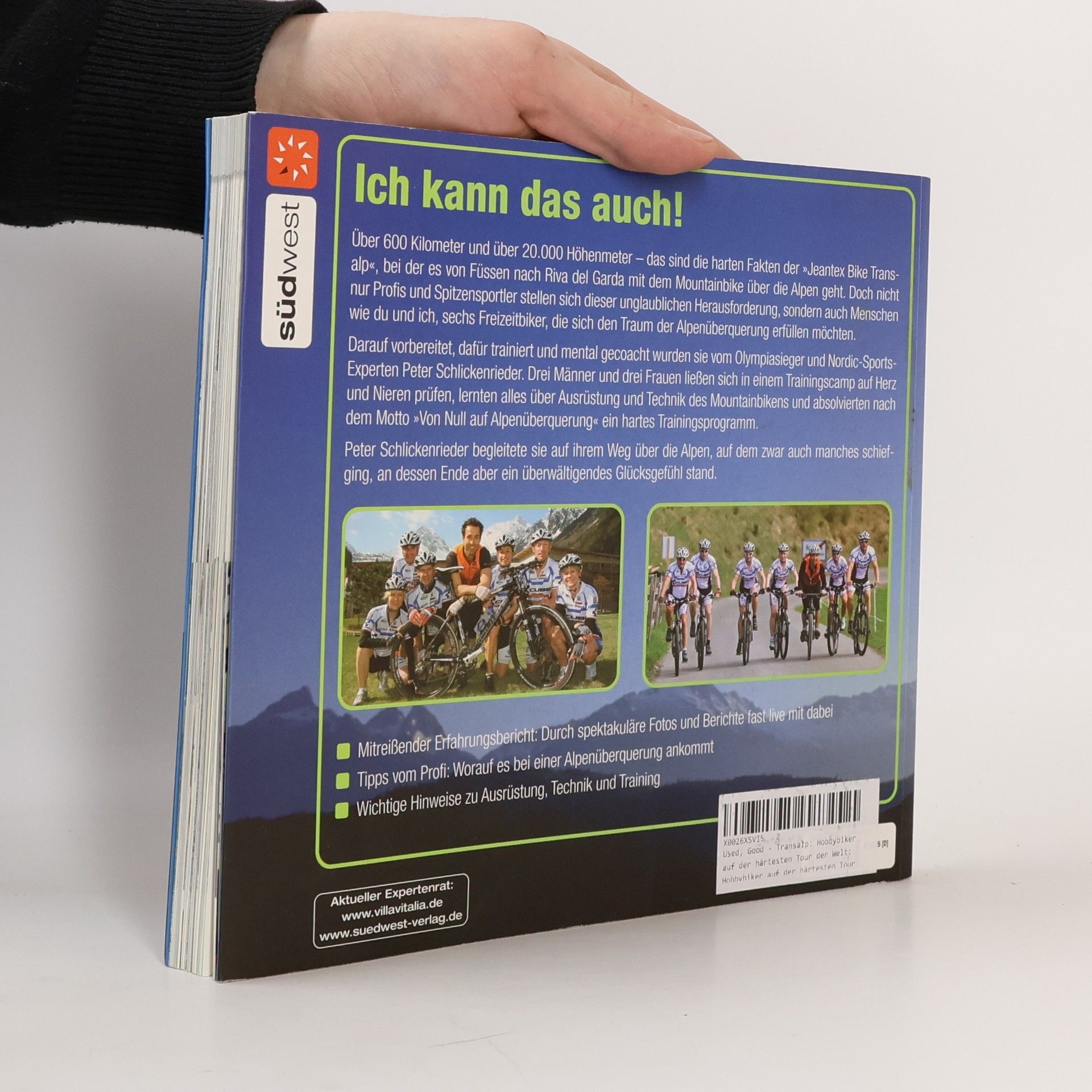 Von Null auf Alpenüberquerung Das ist das härteste Mountainbike-Rennen der Welt: die JEANTEX BIKE TRANSALP. 660 Kilometer und 21.640 Höhenmeter von Füssen nach Riva del Garda sind zu bewältigen und zu überwinden. Schon für professionelle Biker ist diese Alpenüberquerung eine große Herausforderung. Dieses Mal werden sich jedoch auch sechs ganz normale Hobbysportler beteiligen. Peter Schlickenrieder wird sie für dieses Rennen trainieren, coachen und auch begleiten und nach dem Motto „Von Null auf Alpenüberquerung“ die Leistung von Anfang an dokumentieren: beginnend mit dem Teilnehmer-Casting über die verschiedenen Trainings-Etappen und dem Wettkampf selbst. Natürlich gibt es auch nützliche Tipps zur Ausrüstung, Vorbereitung und Durchführung einer Alpenüberquerung.