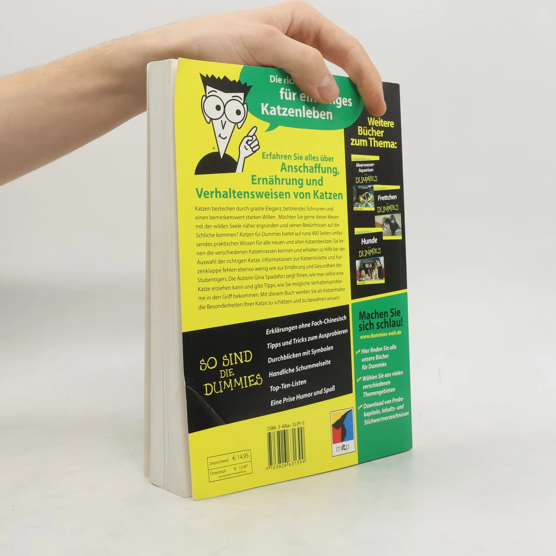 „Katzen für Dummies“ bietet auf rund 400 Seiten umfassendes praktisches Wissen für alle neuen und alten Katzenbesitzer. Sie lernen die verschiedenen Katzenrassen kennen und erhalten so Hilfe bei der Auswahl der richtigen Katze. Informationen zur Katzentoilette und Katzenklappe fehlen ebenso wenig wie zur Ernährung und Gesundheit des Stubentigers. Die Autorin Gina Spadafori zeigt Ihnen, wie man selbst eine Katze erziehen kann und gibt Tipps, wie Sie mögliche Verhaltensprobleme in den Griff bekommen. Mit diesem Buch werden Sie als Katzenhalter die Besonderheiten Ihrer Katze zu schätzen wissen.