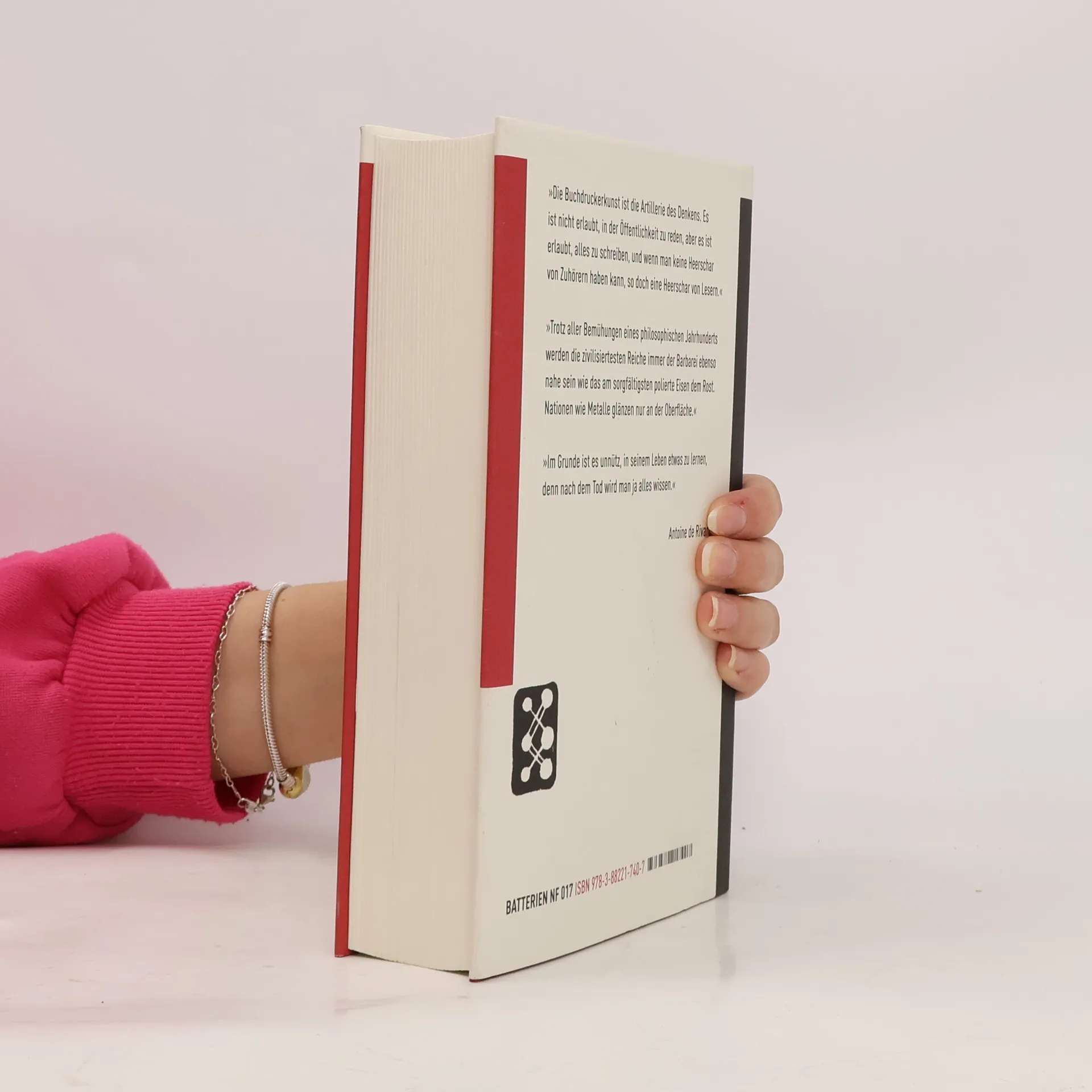 Mit ungeheurem Witz, Schärfe und Esprit nimmt Rivarol seine Mitmenschen, Gott, Tiere, die Politik, die Kunst und die Deutschen ins Visier seiner unvergleichlichen Formulierkunst. Er erweist sich – ein älterer Bruder Nietzsches – als vollendeter und tiefer Menschenkenner, der die menschlichen Leidenschaften rücksichtslos durchleuchtet und sich von keiner noch so perfekten Maske täuschen lässt. Von Ernst Jünger 1956 erstmals in einem biografischen Essay und mit einer kleinen Auswahl dem deutschen Publikum vorgestellt, ist es jetzt möglich, Rivarol, der eine bedeutende subkutane Rezeptionsgeschichte in Deutschland hat, in seiner ganzen Bandbreite kennenzulernen. Ulrich Kunzmann hat alle veröffentlichten Texte dieses Ausnahmedenkers gesammelt und pointiert ins Deutsche übersetzt.