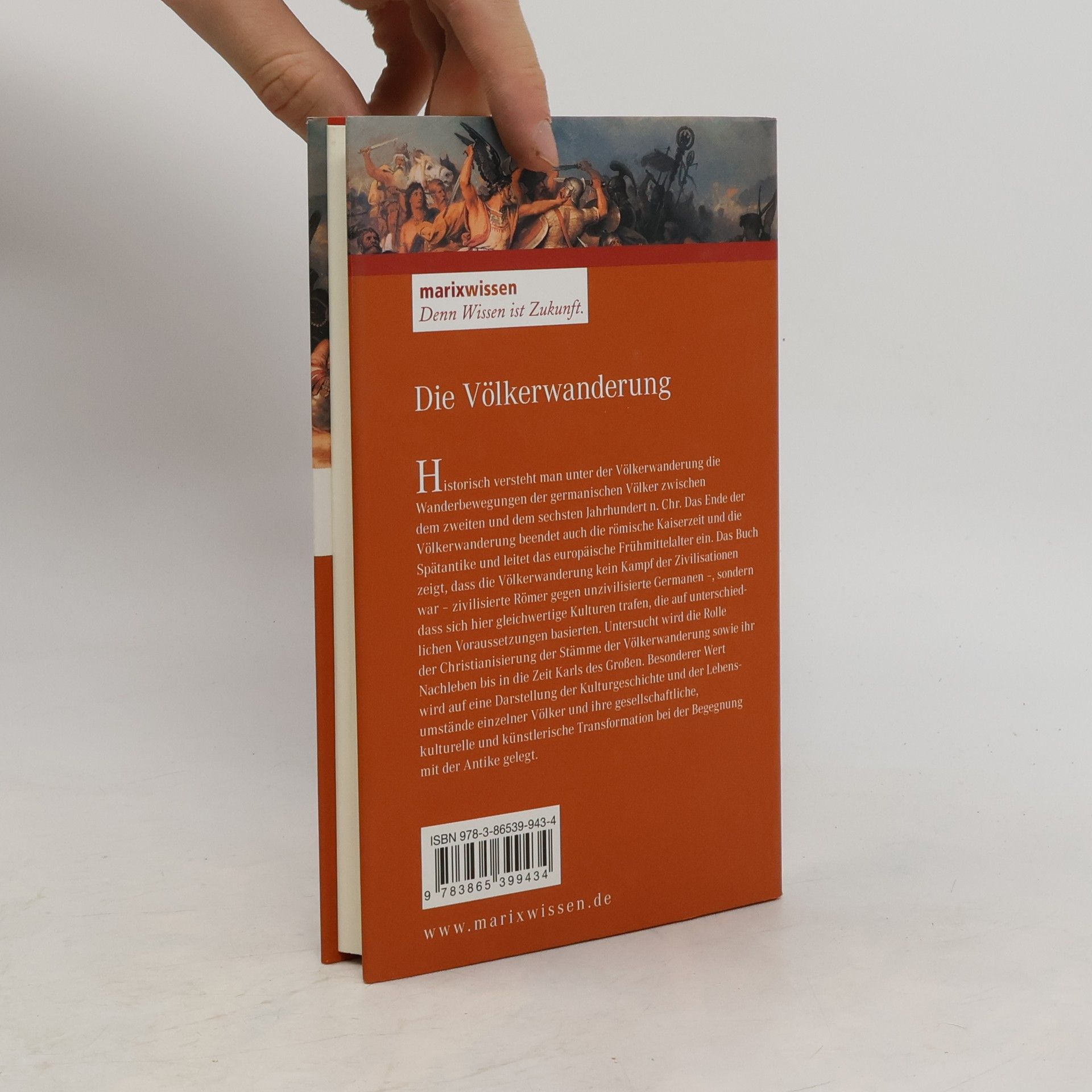 Historisch versteht man unter der Völkerwanderung die Wanderbewegungen der germanischen Völker zwischen dem zweiten und dem sechsten Jahrhundert n. Chr. Als Völkerwanderungszeit im engeren Sinne wird der Zeitraum von 375 bis 568, vom Einbruch der Hunnen nach Ostmitteleuropa bis zum Einfall der Langobarden in Norditalien, bezeichnet. Das Ende der Völkerwanderung beendet auch die römische Kaiserzeit und die Spätantike und leitet das europäische Frühmittelalter ein. Das Buch zeigt, dass die Völkerwanderung kein Kampf der Zivilisationenwar – zivilisierte Römer gegen unzivilisierte Germanen –, sondern dass sich hier gleichwertige Kulturen trafen, die auf unterschiedlichen Voraussetzungen basierten. Die neu eingewanderten Stämme und Völker nahmen rasch römische Sitten und Bräuche bis hin zu Verwaltung und Steuerwesen an und schufen in dieser Synthese bleibende Kulturdenkmäler. Untersucht wird die Rolle der Christianisierung der Stämme der Völkerwanderung sowie ihr Nachleben bis in die Zeit Karls des Großen. Besonderer Wert wird auf eine Darstellung der Kulturgeschichte und der Lebensumstände einzelner Völker und ihre gesellschaftliche, kulturelle und künstlerische Transformation bei der Begegnung mit der Antike gelegt.