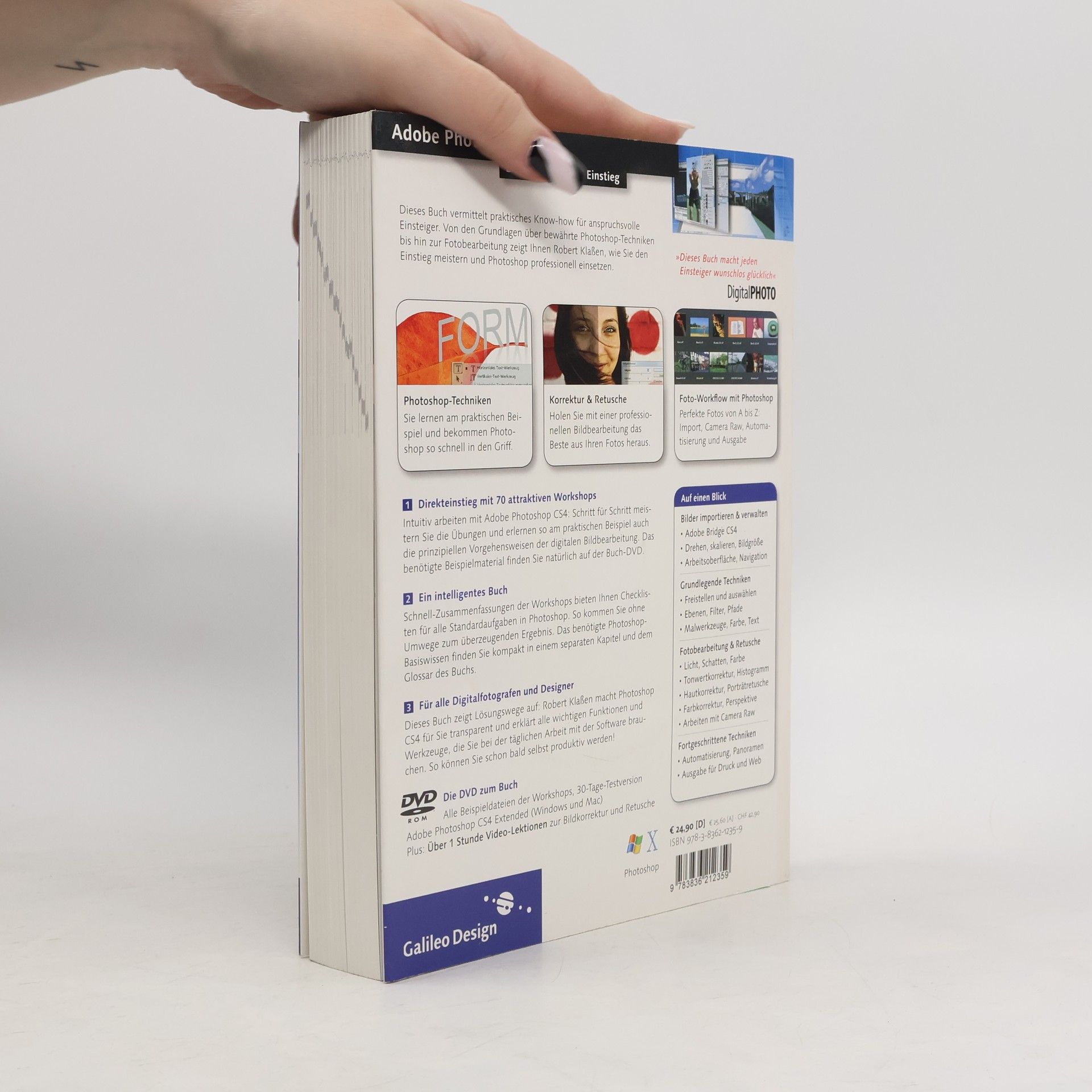 Gute Fotos sind oft nur wenige Mausklicks entfernt – dieses Buch vermittelt praktisches Know-how für professionelle Einsteiger im Grafik- und Fotobereich. Es behandelt spannende Themen wie Bildkorrektur, Retusche, Beleuchtungs- und Farboptimierung, Automatisierung und Ausgabe. Neue Funktionen von CS4 werden ebenso behandelt wie bewährte Photoshop-Techniken. Die Struktur des Buches ermöglicht es Ihnen, die Workshops zu meistern und Lösungen für eigene Anwendungsfälle zu entwickeln. Schnell-Zusammenfassungen am Ende eines Workshops fassen die Schritte übersichtlich zusammen, sodass Sie Ihre Checklisten für verschiedene Aufgaben stets zur Hand haben. Ein separates Fachkunde-Kapitel bietet fundierte Hintergrundinformationen, ohne die praktische Arbeit zu bremsen. Bei Fragen sind alle Erklärungen schnell verfügbar. Die Themen umfassen unter anderem das Importieren und Verwalten von Bildern, grundlegende Techniken, Fotobearbeitung, Retusche, fortgeschrittene Techniken und die Ausgabe für Druck und Web.