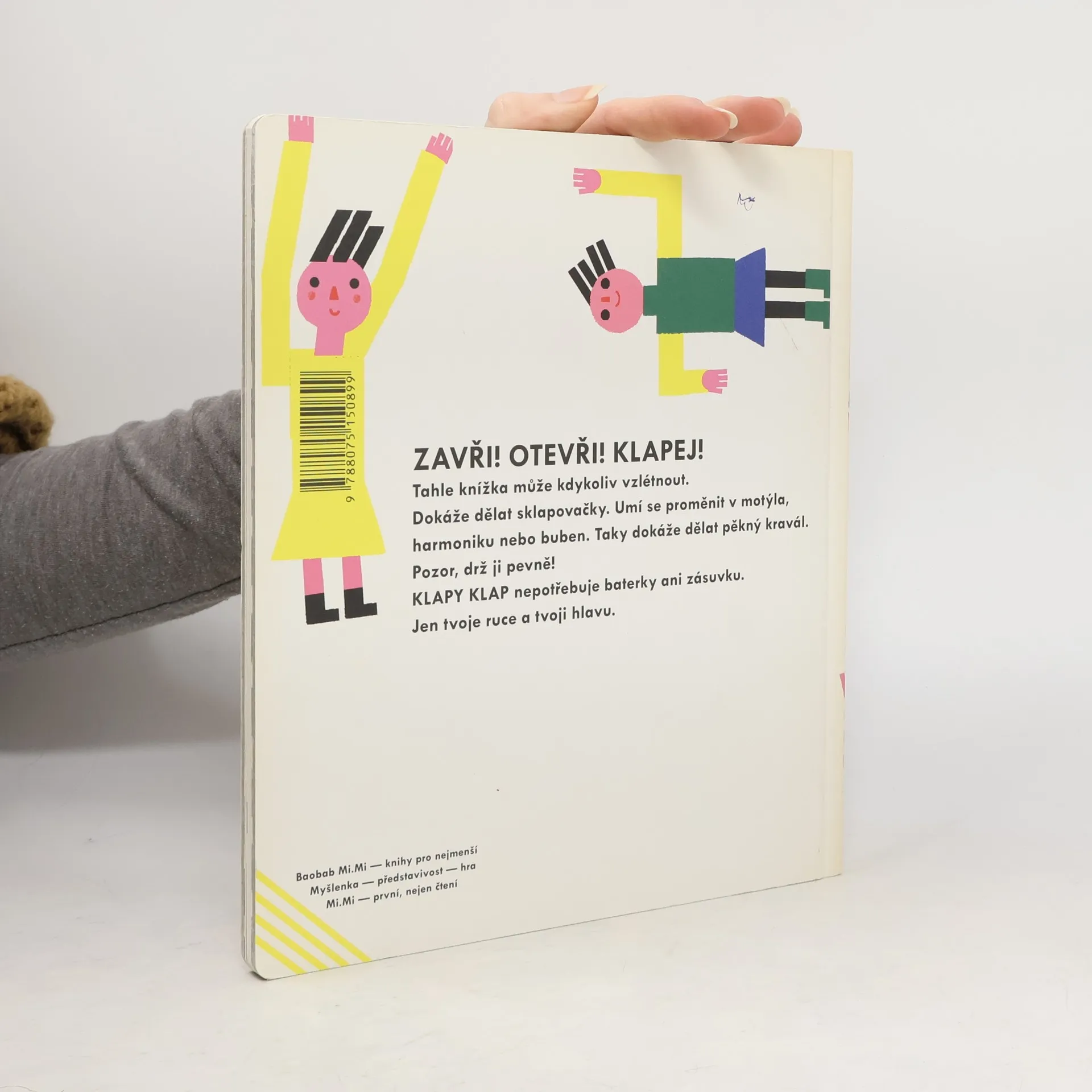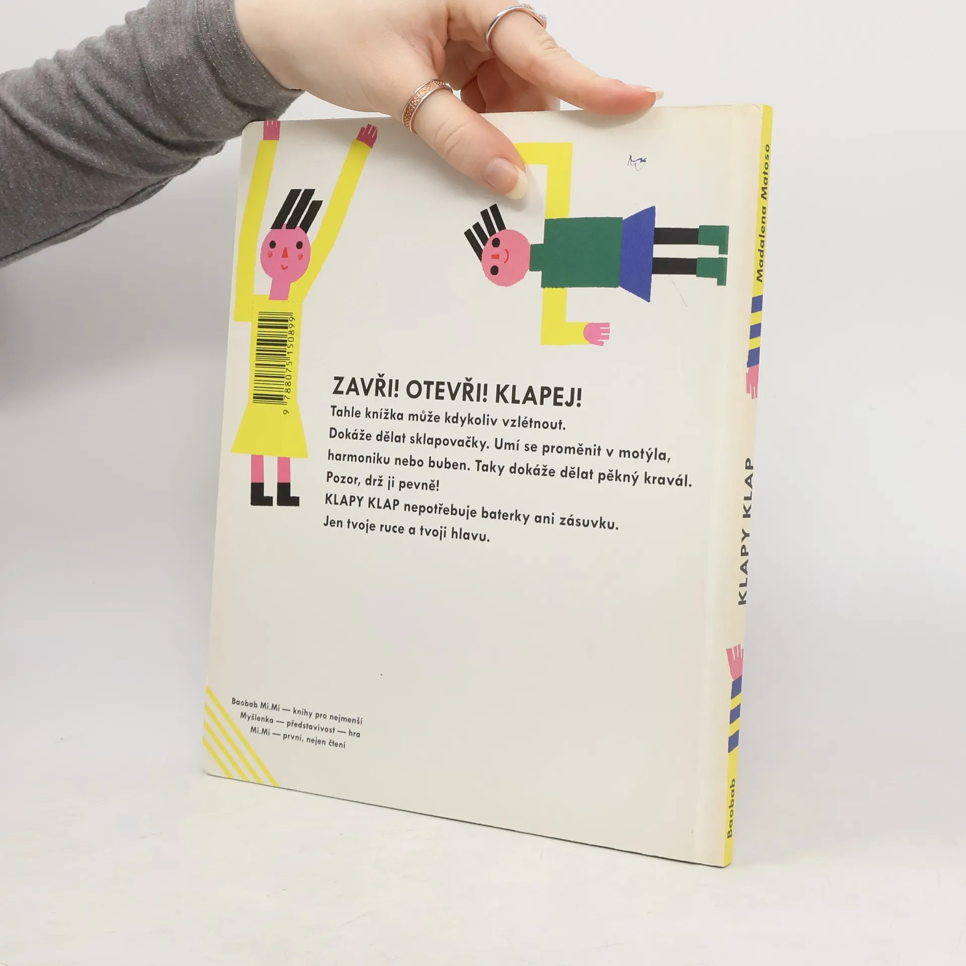 Pro nejmenší: Zavři! Otevři! Klapej! Tahle knížka může kdykoliv vzlétnout. Dokáže dělat sklapovačky. Umí se proměnit v motýla, harmoniku nebo buben. Klapy klap nepotřebuje baterky ani zásuvku. Jen tvoje ruce a tvoji hlavu. Výtvarnice Madalena Matoso sestavila knížku pro nejmenší čtenáře tak, aby ji děti opravdu rády braly do rukou. Knížka, kterou internet nikdy nedohoní.
