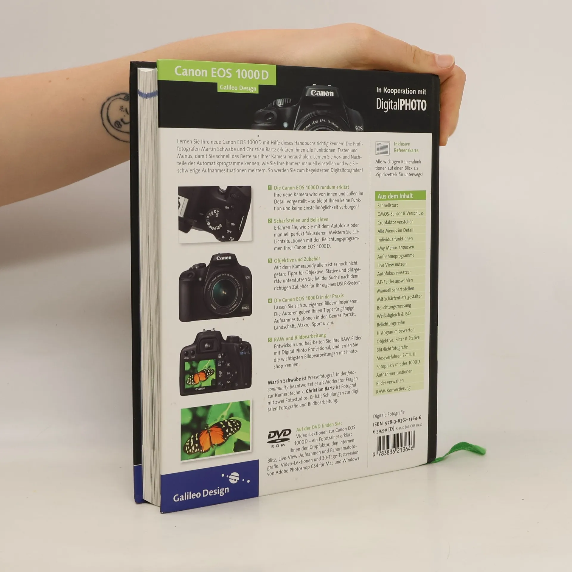 Möchten Sie mit der Canon EOS 1000D in die digitale Spiegelreflexfotografie einsteigen? Dieses Kamerahandbuch erleichtert Ihnen die ersten Schritte! Die Autoren erklären die Kameratechnik im Detail und veranschaulichen Funktionen und Menüs mit attraktiven Beispielbildern. Lernen Sie die Aufnahmeprogramme kennen und erfahren Sie, wie Sie mit Ihrer EOS 1000D richtig belichten, scharfstellen und blitzen. Im Kapitel „Fotopraxis“ finden Sie Inspiration für Ihre eigenen Aufnahmen. Tipps zu Objektiven und Zubehör helfen Ihnen, ein individuelles DSLR-System aufzubauen. Auch der Prozess nach der Aufnahme wird behandelt: vom Import über die Verwaltung bis zur digitalen Nachbearbeitung Ihrer Bilder am PC. Zusätzlich gibt es eine praktische Referenzkarte für unterwegs sowie eine DVD mit Video-Lektionen zu spannenden Themen wie Cropfaktor, Panoramafotografie, Live View und internem Blitz. Der Inhalt umfasst einen Schnellstart, CMOS-Sensor & Verschluss, das Verständnis des Cropfaktors, detaillierte Menüs, Individualfunktionen, Aufnahmeprogramme, Autofokus, Belichtungsmessung, Weißabgleich & ISO, Blitzlichtfotografie und RAW-Konvertierung.
