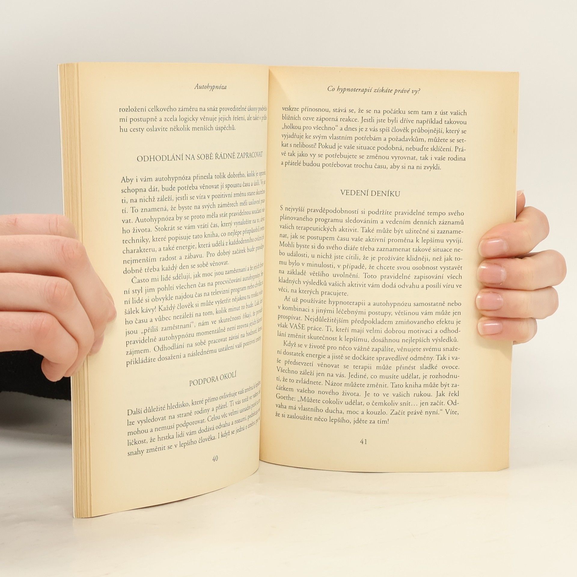Kniha seznamuje s historií autohypnózy a s možnostmi jejího uplatnění při zvládání stresu, překonání bolesti či zpestření sexuálního života. Autohypnóza má široké uplatnění jako hodnotná pomůcka při překonávání mnoha problémů spojených s naším moderním životním stylem. Tato seriózní, sdílná a snadno pochopitelná kniha je dobrým úvodem pro její další studium a popisuje řadu snadno zvládnutelných technik, s jejichž pomocí se může každý člověk se svými problémy vypořádat sám. Je ideální pro ty, kteří s hypnózou teprve začínají, a stejně tak pro hypnoterapeuty s vlastní praxí. Přehledně, ale také důkladně popisuje postupy, jak: hypnózu přivodit; odnaučit se s její pomocí např. kouřit nebo se konečně přestat nezdravě přejídat; zvládnout stres a překonat obavy; zpestřit svůj sexuální život; přinejmenším si částečně ulevit od premenstruačních obtíží, alergií, astmatu a vysokého krevního tlaku; autohypnózou překonat bolest; vypěstovat si zdravou sebedůvěru a sebeúctu.