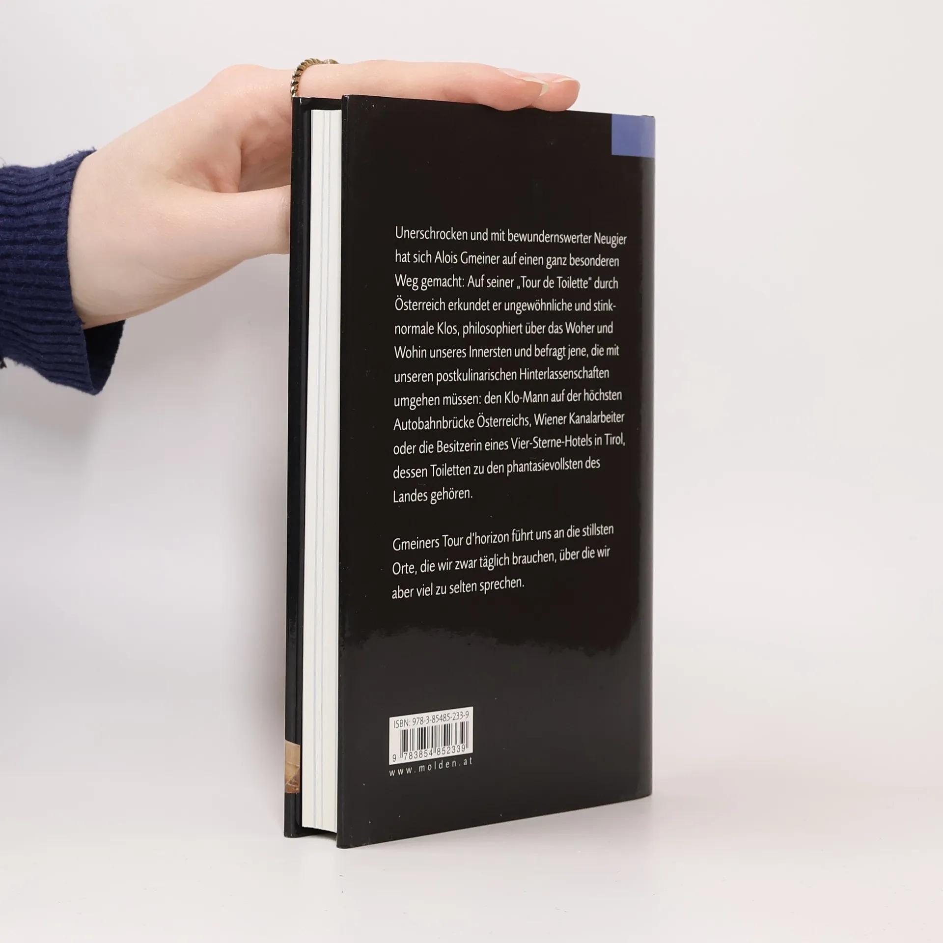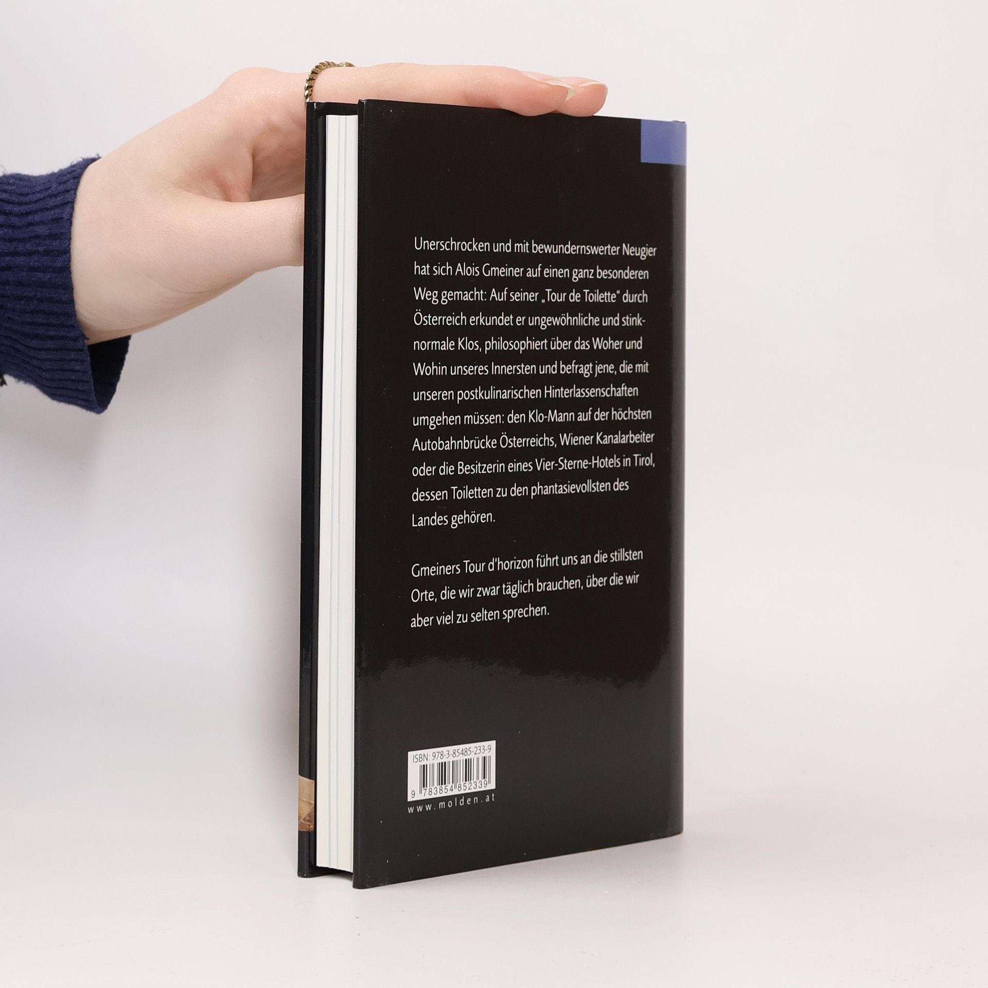 Unerschrocken und mit bewundernswerter Neugier hat sich Alois Gmeiner auf einen ganz besonderen Weg gemacht: Auf seiner „Tour de Toilette“ durch Österreich erkundet er die ungewöhnlichsten Klos und befragt jene, die sich mit unseren postkulinarischen Hinterlassenschaften tagtäglich umgehen müssen: den WC-Wart auf der höchsten Autobahnbrücke Österreichs, den Leiter einer Kläranlage in Kärnten, die Besitzerin eines Vier-Sterne-Hotels in Tirol, das die phantasievollsten Toiletten ihr Eigen nennt und viele mehr. Gmeiners Reisebericht philosophiert über das Woher und Wohin, denkt über fremdländische Klo-Sitten genauso wie über die Gründe dafür nach, weshalb sich Ruhesuchende mittels Kurzprosa auf Abort-Wänden verewigen und auch darüber, weshalb man in Österreich nach der Toilette fragt, im prüden Amerika sich hingegen verschämt erkundigt: „Where is the bathroom?“