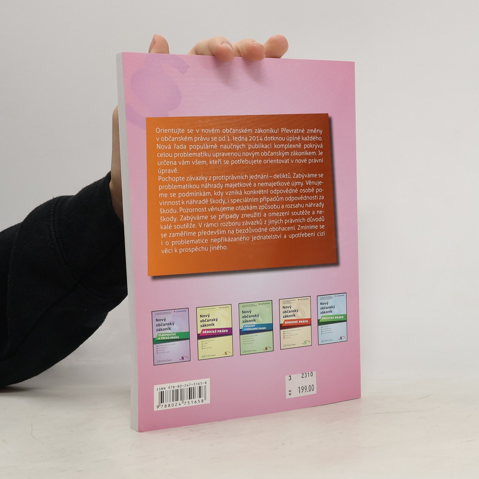 Orientujte se v novém občanském zákoníku! Převratné změny v občanském právu se od 1. ledna 2014 dotknou úplně každého. Nová řada populárně naučných publikací komplexně pokrývající celou problematiku upravenou novým občanským zákoníkem je určena hlavně čtenářům, kteří nejsou právními odborníky, ale potřebují se orientovat v nové právní úpravě. Šestou část celé řady věnujeme problematice závazků z protiprávních jednání - deliktů. Nejprve se zabýváme problematikou náhrady majetkové a nemajetkové újmy a podmínkám, kdy vzniká konkrétní odpovědné osobě povinnost k náhradě škody i speciálním případům odpovědnosti za škodu. Pozornost bude věnována otázkám způsobu a rozsahu náhrady škody. Zabýváme se případy zneužití a omezení soutěže a nekalé soutěže. V rámci rozboru závazků z jiných právních důvodů se zaměříme především na bezdůvodné obohacení, zmíníme se též o problematice nepřikázaného jednatelství a upotřebení cizí věci k prospěchu jiného.