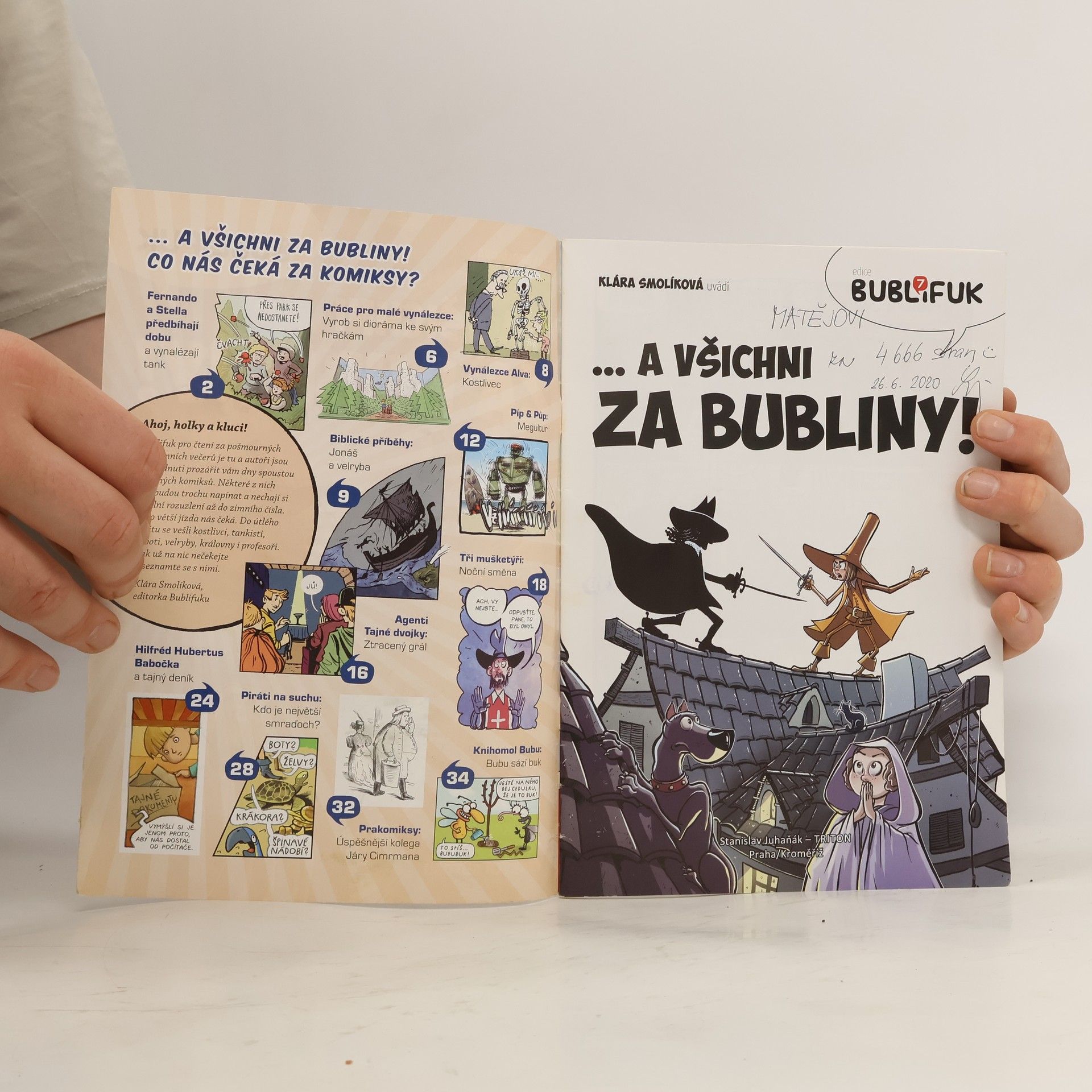 Fernando a Stella předbíhají dobu a vynalézají tank! Píše Jiří W. Procházka a kreslí Vojtěch Šeda. Vynálezce Alvu v tomto díle čeká kostlivec, navíc rozklepaný. Kreslí Luděk Bárta, píše Klára Smolíková a Jiří W. Procházka. „Jonáš a velryba“ je druhý z biblických příběhů, který do komiksu převedla Klára Smolíková a nakreslil Karel Jerie. Roboti Píp a Půp a díl nazvaný „Megultur“, napsal Martin Šinkovský a nakreslil Ticho 762. Agenti Tajné dvojky řeší třetí případ nazvaný „Ztracený grál“. Napsala Klára Smolíková a nakreslil Viktor Svoboda. Komiks Tři mušketýři a příhoda „Noční směna“ napsal a nakreslil Petr Kopl. Další bláznivé vyprávění Hilfréda Hubertuse Babočky chystá Tomáš Kučerovský. Piráty na suchu čeká smrad a puch. Jak si s tím poradí? Napsala Klára Smolíková a nakreslil Lukáš Fibrich. Prakomiksy! Tomáš Prokůpek připravil stránku o Karlovi Václavu Klíči a díl pojmenoval „Úspěšnější kolega Járy Cimrmana". Knihomol Bubu sází strom. Díl, který podle námětu Ondřeje Buchala píše a kreslí Bára Buchalová, sedmé číslo uzavře.