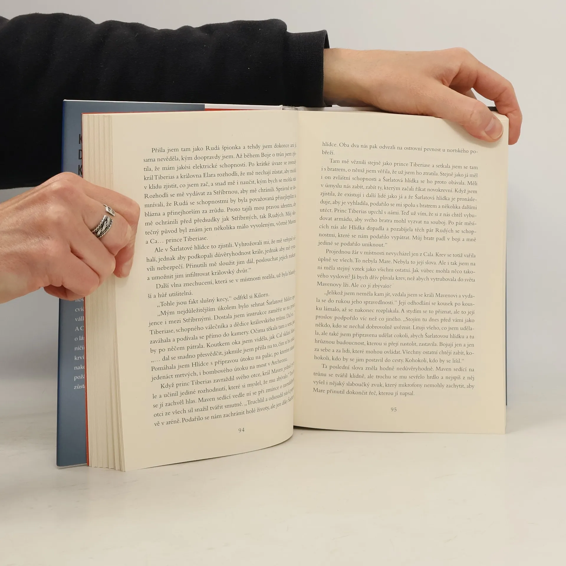 Mare Barrowová je ve vězení, bez svého blesku nemá žádnou moc a neustále ji trýzní osudové chyby, jichž se dopustila. Je vydaná napospas chlapci, jejž kdysi milovala, chlapci, který je lhář a zrádce. Maven Calore, nyní král, dál pokračuje v plánech své mrtvé matky ve snaze udržet i vládu nad svou zemí – a nad svou vězeňkyní. Mare v paláci nese tíhu Tichého kamene a její kdysi ubohá skupinka povstalců a Rudých se mezitím dále organizuje, trénuje a expanduje. Nechtějí se už schovávat ve stínech a připravují se na válku. A Cal, princ ve vyhnanství, který se také uchází o Mareino srdce, udělá všechno proto, aby ji získal zpátky. Když se krev obrátí proti krvi a schopnost proti schopnosti, možná nezbyde nikdo, kdo by uhasil oheň – a Norta, jak ji Mare zná, shoří do základů.