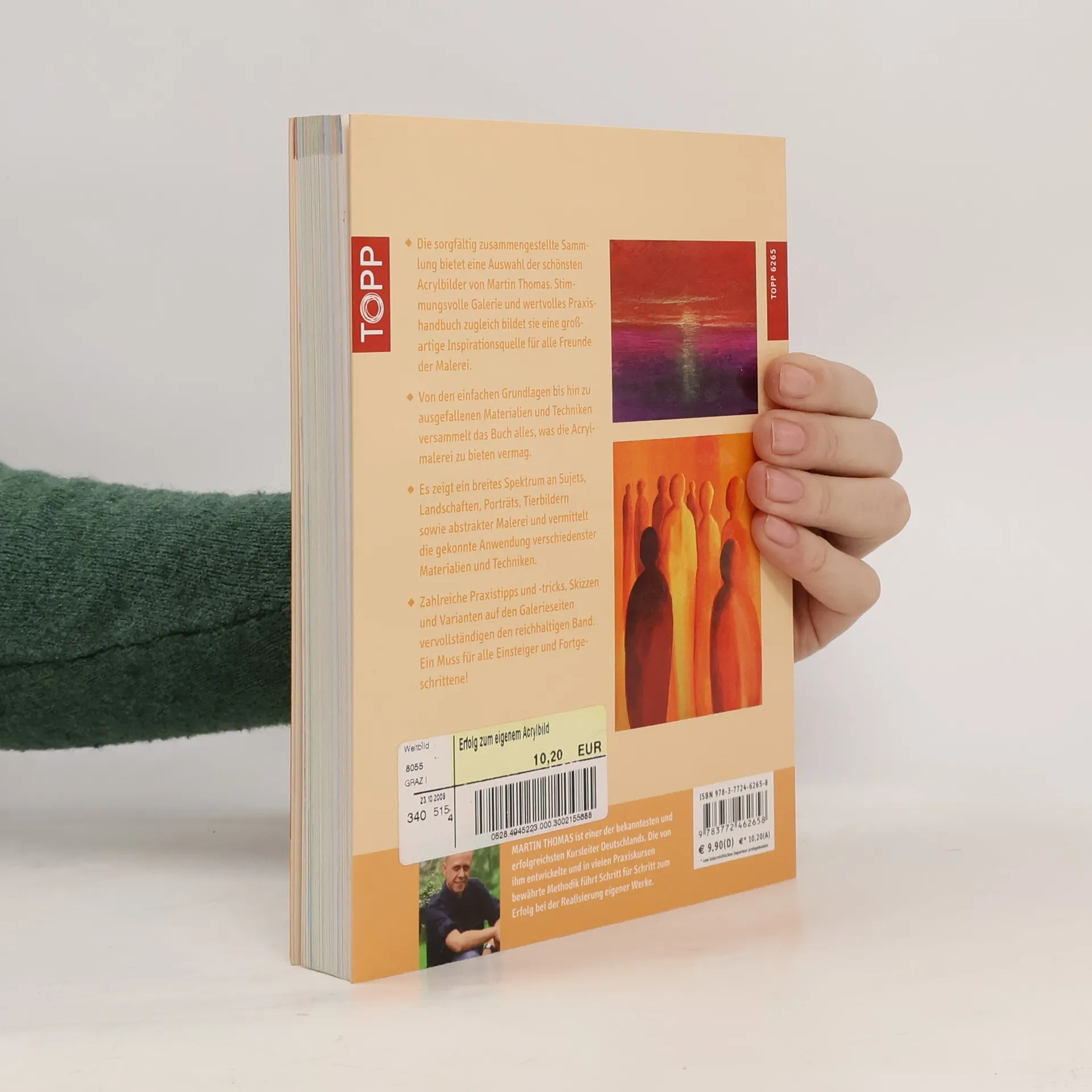 Sorgfältig zusammengestellte Sammlung mit einer Auswahl der schönsten Acrylbilder von Martin Thomas. Inspirationsquelle für alle Freunde der Malerei, von den Grundlagen bis hin zu ausgefallenen Materialien und Techniken der Acrylmalerei. Die von Martin Thomas entwickelte und in vielen Praxiskursen bewährte Methodik führt Schritt für Schritt zum Erfolg. Breites Spektrum an Sujets: Landschaften, Porträts, Tierbilder sowie abstrakte Malerei. Zahlreiche Praxistipps und -tricks, Skizzen und Varianten auf den Galerieseiten vervollständigen den reichhaltigen Band. 208 Seiten, 16 x 21 cm, Softcover