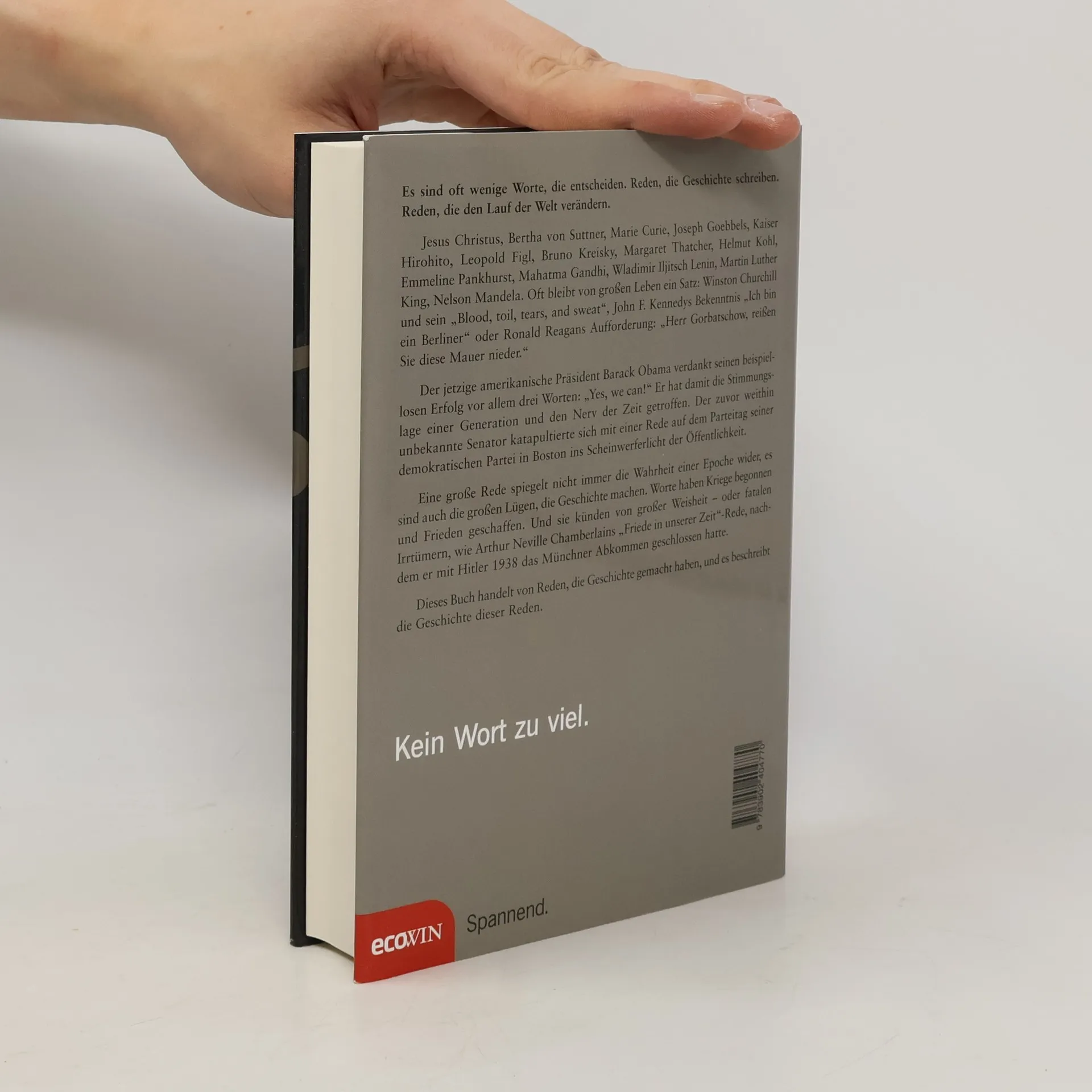 Es sind oft wenige Worte, die entscheiden. Reden, die Geschichte schreiben. Reden, die den Lauf der Welt verändern. Jesus Christus, Bertha von Suttner, Marie Curie, Joseph Goebbels, Kaiser Hirohito, Leopold Figl, Bruno Kreisky, Margaret Thatcher, Helmut Kohl, Lech Walesa, Václav Havel, Michail Gorbatschow, Martin Luther King, Nelson Mandela. Oft bleibt von großen Leben ein Satz: Winston Churchill und sein „Blood, toil, tears, and sweat“, John F. Kennedys Bekenntnis „Ich bin ein Berliner“ oder Ronald Reagans Aufforderung: „Herr Gorbatschow, reißen Sie diese Mauer nieder.“ Der jetzige amerikanische Präsident Barack Obama verdankt seinen beispiellosen Erfolg vor allem drei Worten: „Yes, we can!“ Er hat damit die Stimmungslage einer Generation und den Nerv der Zeit getroffen. Der zuvor weithin unbekannte Senator katapultierte sich mit einer Rede auf dem Parteitag seiner demokratischen Partei in Boston ins Scheinwerferlicht der Öffentlichkeit. Eine große Rede spiegelt nicht immer die Wahrheit einer Epoche wider, es sind auch die großen Lügen, die Geschichte machen. Worte haben Kriege begonnen und Frieden geschaffen. Und sie künden von großer Weisheit – oder fatalen Irrtümern, wie Neville Chamberlains „Friede in unserer Zeit“-Rede, nachdem er mit Hitler 1938 das Münchner Abkommen geschlossen hatte. Dieses Buch handelt von Reden, die Geschichte gemacht haben und es beschreibt die Geschichte dieser Reden.