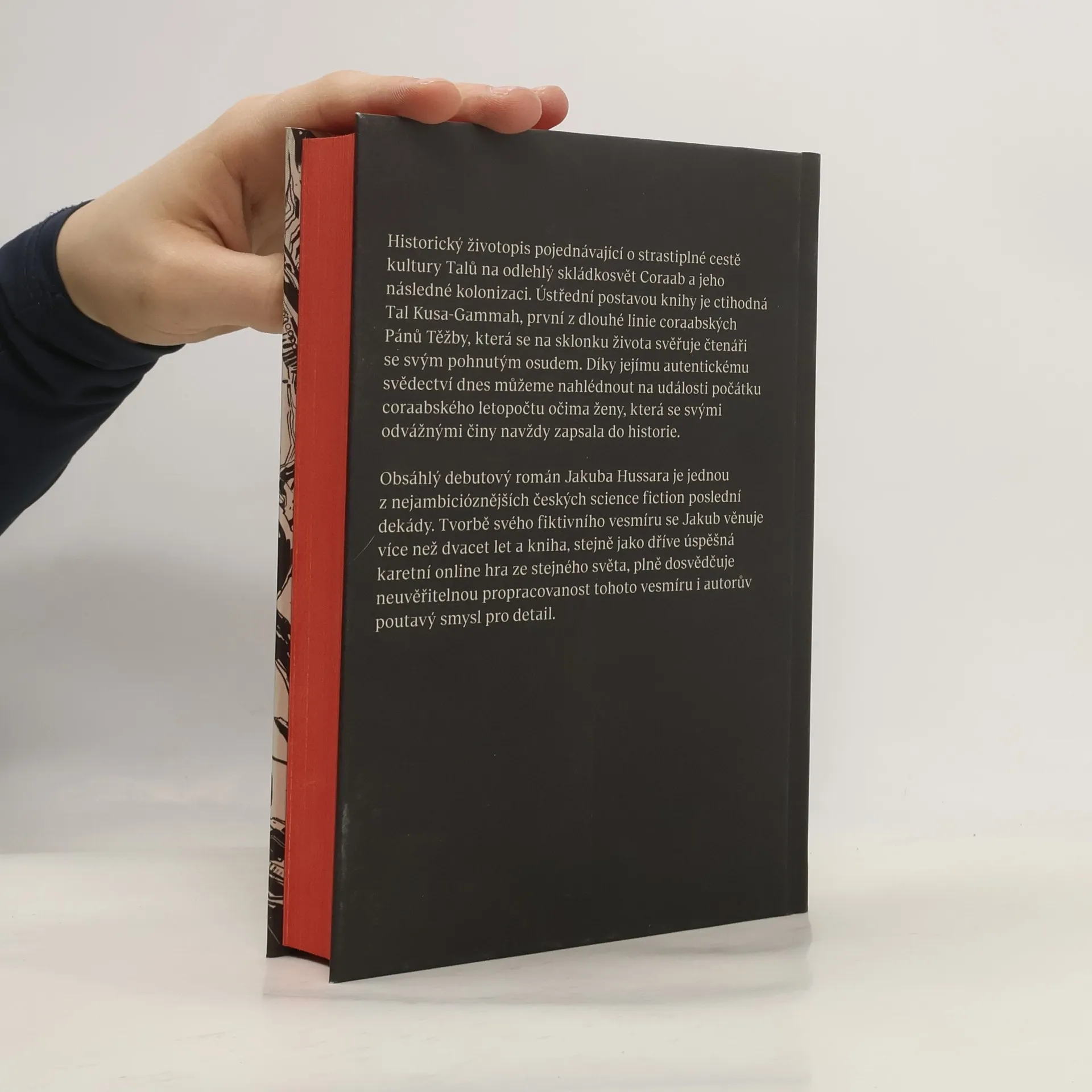 Obsáhlý debutový román Jakuba Hussara je jednou z nejambicióznějších českých science fiction poslední dekády. Tvorbě svého fiktivního vesmíru se Jakub věnuje více než dvacet let a kniha, stejně jako dříve úspěšná karetní online hra ze stejného světa, plně dosvědčuje neuvěřitelnou propracovanost tohoto vesmíru i autorův poutavý smysl pro detail. Historický životopis pojednávající o strastiplné cestě kultury Talů na odlehlý skládkosvět Coraab a jeho následné kolonizaci. Ústřední postavou knihy je ctihodná Tal Kusa-Gammah, první z dlouhé linie coraabských Pánů Těžby, která se na sklonku života svěřuje čtenáři se svým pohnutým osudem. Díky jejímu autentickému svědectví dnes můžeme nahlédnout na události počátku coraabského letopočtu očima ženy, která se svými odvážnými činy navždy zapsala do historie.