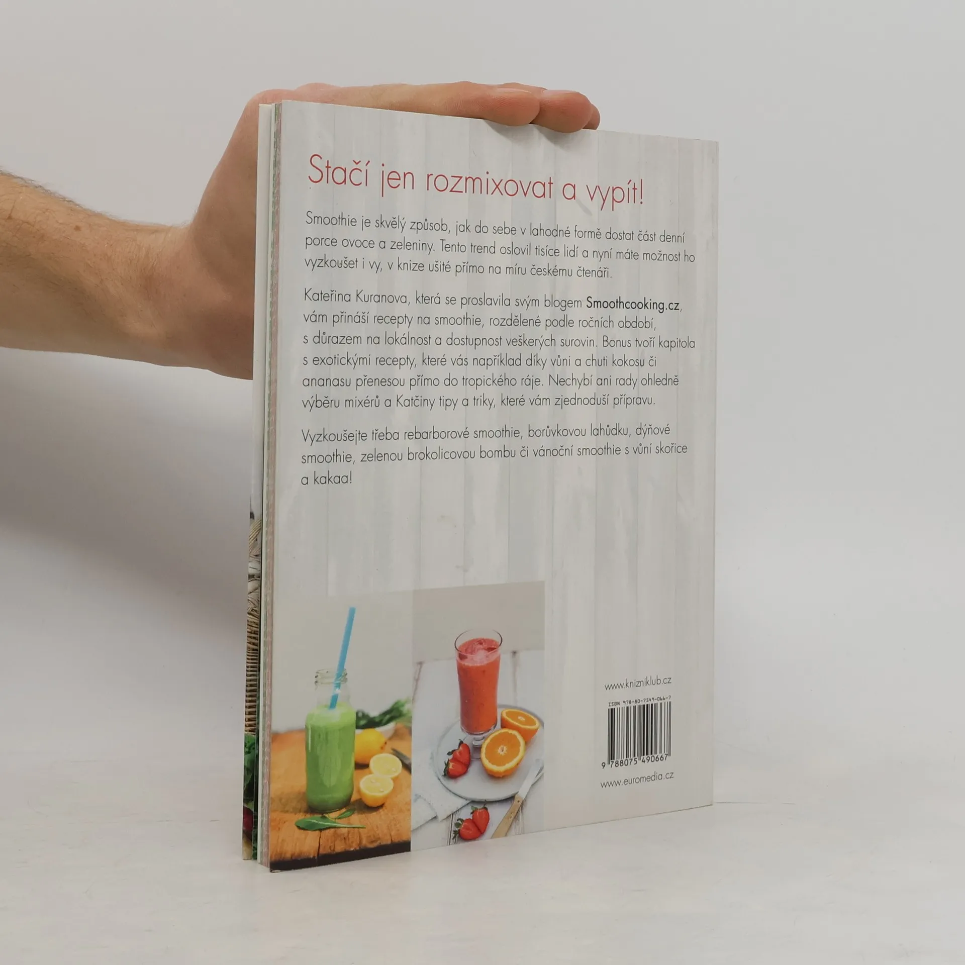 Kniha známé české foodblogerky Kateřiny Kuranovy z blogu Smoothcooking.cz ukazuje, jak si jednoduše připravit smoothie se sezónních, snadno dostupných a lokálních surovin. Recepty jsou rozdělené podle ročních období a nechybí ani osvědčené rady a tipy. České smoothie je kuchařka pro každý den, plná energie, inspirace a pohody.