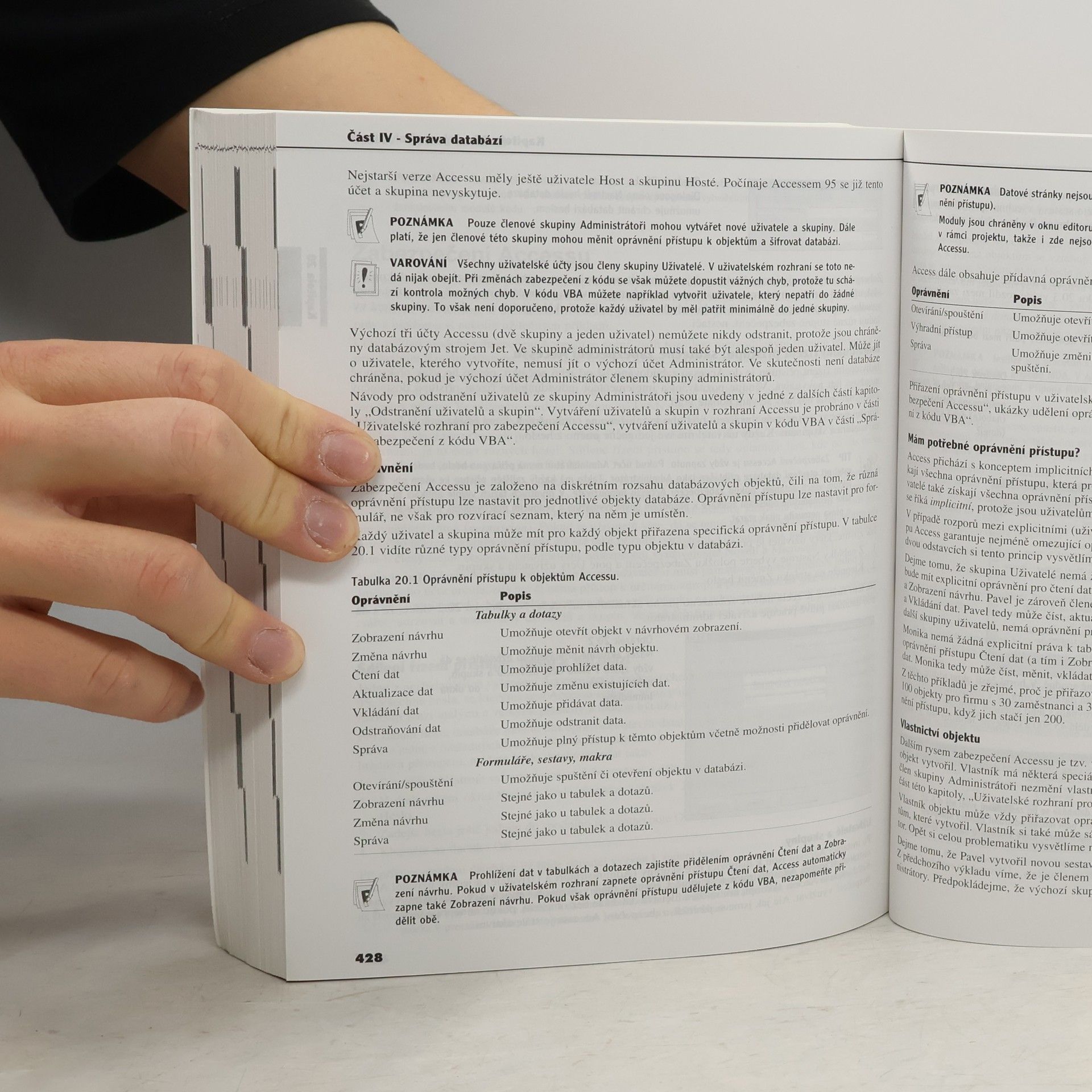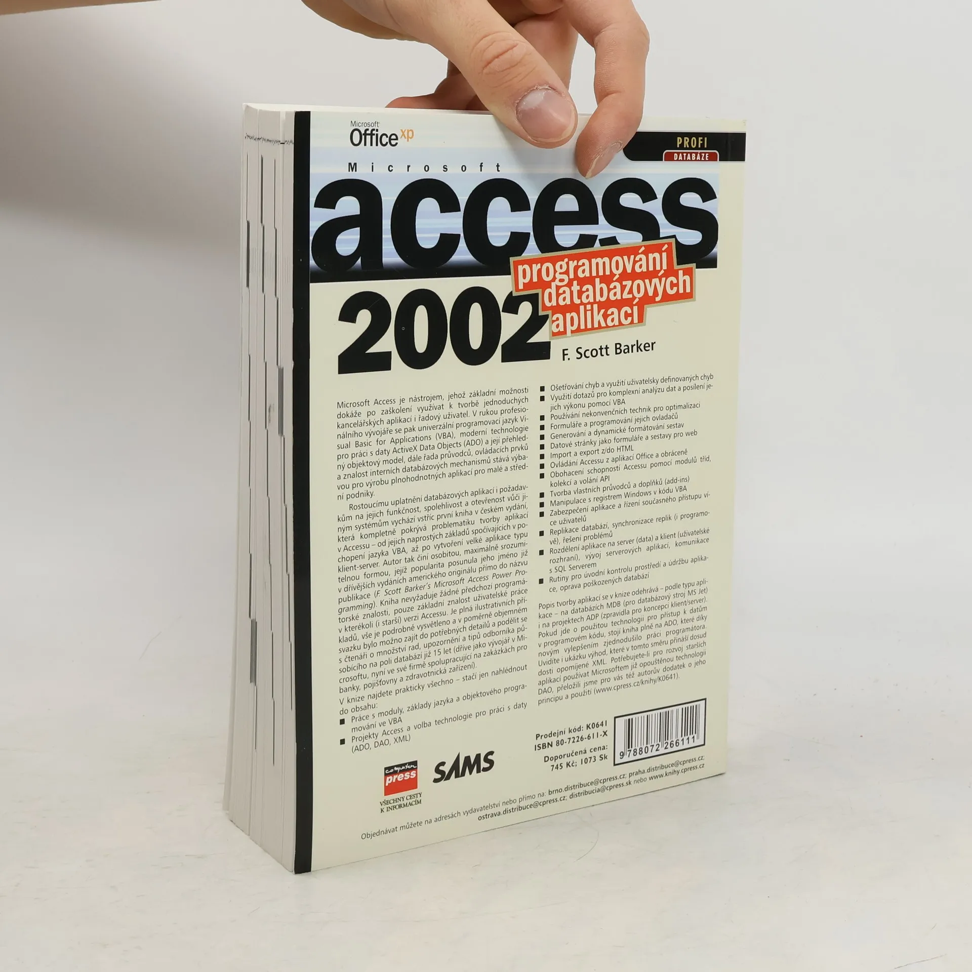 Kompletní kniha o programování databázových aplikací v Accessu. Nezabývá se již překonanými makry ani popisem neprogramových nástrojů, jde přímo k jazyku VBA, modulům, objektům a událostnímu programování. Z přístupových technologií dává na výběr DAO i modernější ADO, probírá programování formulářů, sestav, datových stránek a internetových aplikací, využití složitějších dotazů či prvků ActiveX. Vysvětluje volání API, moduly tříd, demonstruje spolupráci s aplikacemi Office, práci s registrem. Podrobně probírá víceuživatelské aplikace a jejich zabezpečení, replikaci, automatizaci správcovských operací, model klient-server a komunikaci s SQL Serverem.