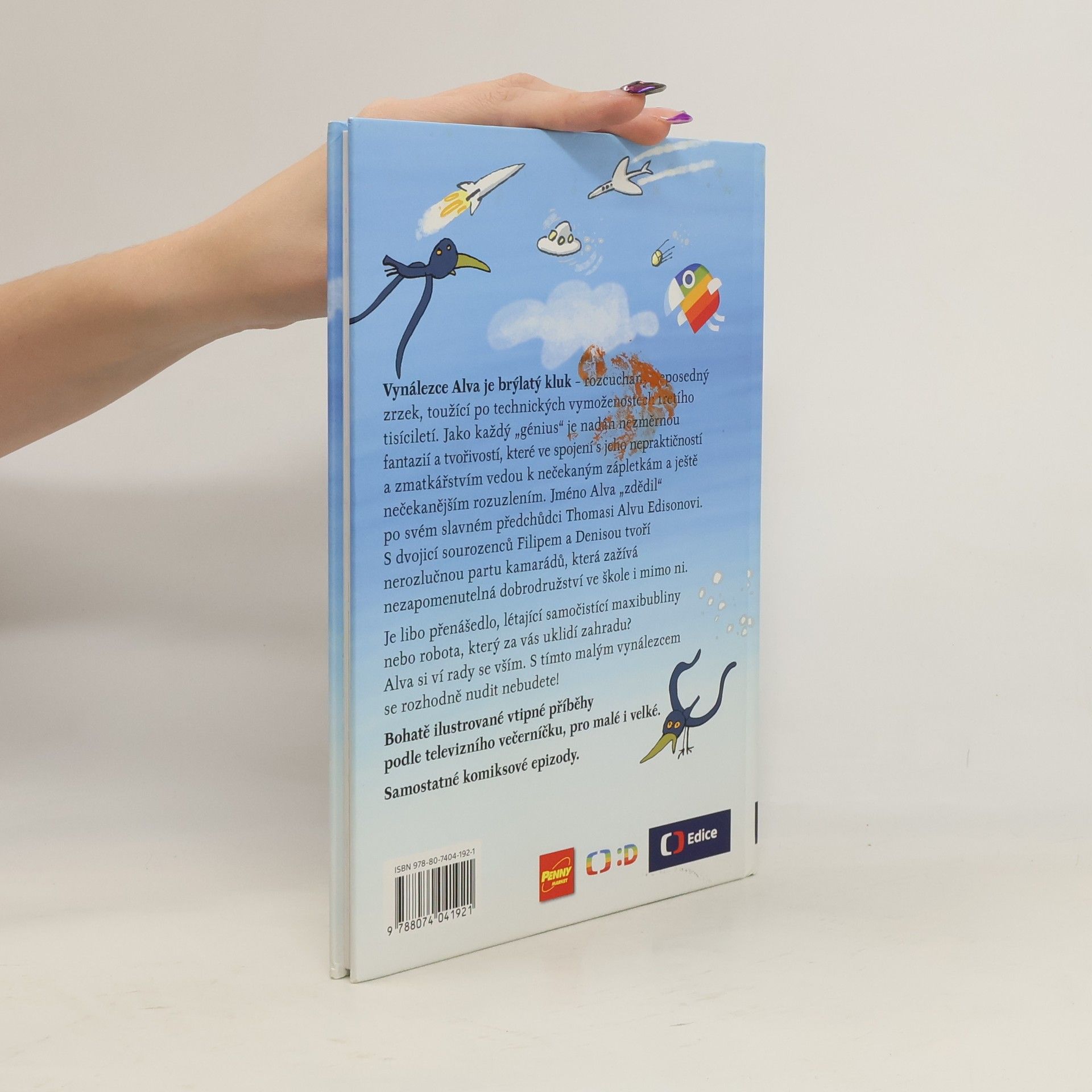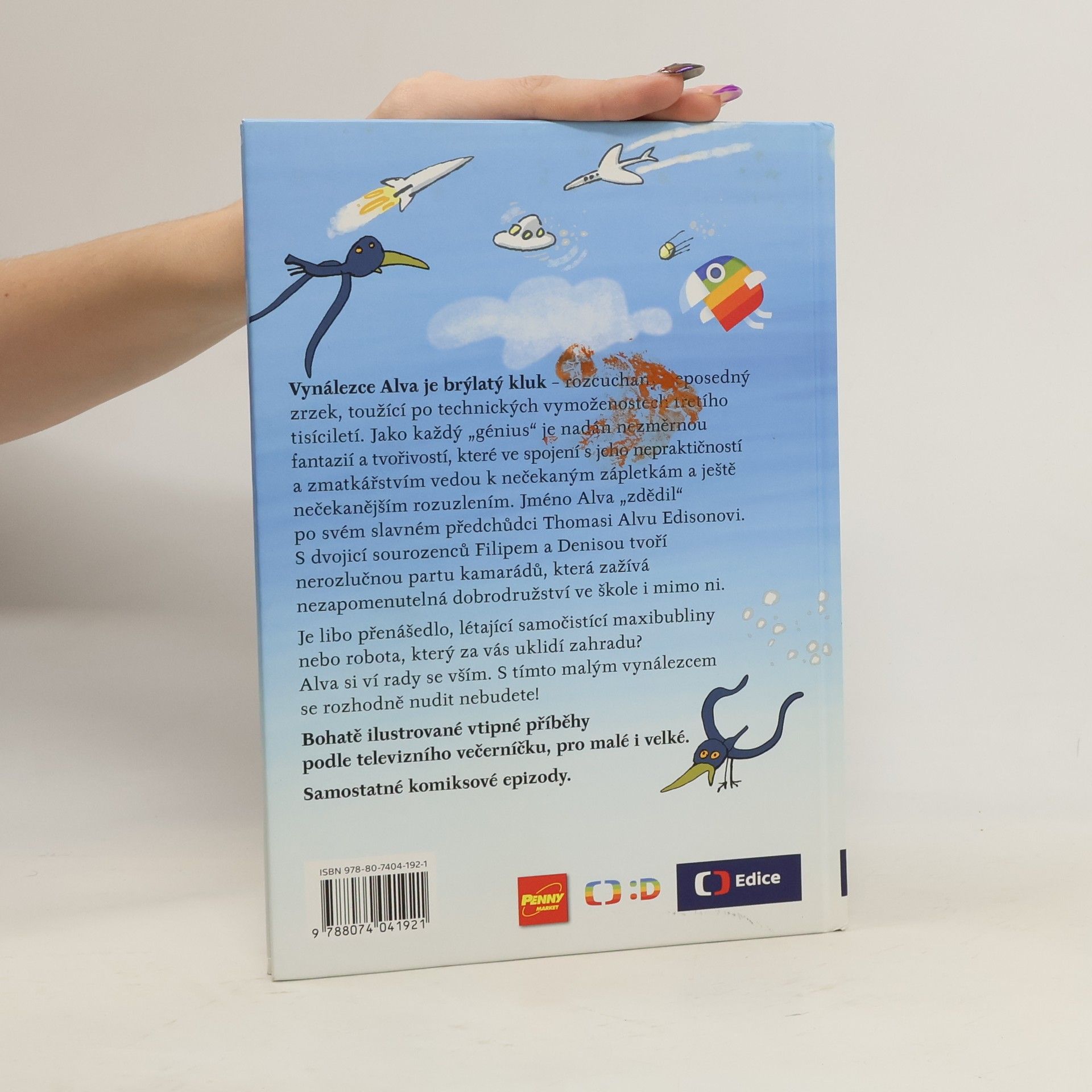 Je libo raketobrusle, přenášedlo, létající samočistící maxibubliny nebo robota, který za vás uklidí zahradu? Alva si ví rady se vším. S tímto vynálezcem se rozhodně nudit nebudete! Vynálezce Alva je brýlatý kluk – rozcuchaný neposedný zrzek, toužící po technických vymoženostech třetího tisíciletí. Jméno Alva „zdědil“ po svém slavném předchůdci T. A. Edisonovi. Jako každý génius je nadán nezměrnou fantazií a tvořivostí, které ve spojení s jeho nepraktičností a zmatkářstvím vedou k nečekaným zápletkám a ještě nečekanějším rozuzlením. S dvojicí sourozenců Filipem a Denisou tvoří nerozlučnou partu kamarádů, která zažívá neuvěřitelná dobrodružství ve škole i mimo ni. Náš příběh začíná první školní den… Bohatě ilustrované vtipné příběhy podle televizního večerníčku, pro malé i velké. 2.,upravené vydání.